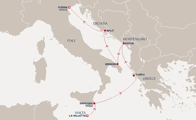 Маршрут круиза: Чивитавеккья / Рим - Генуя / Милан - Марсель - Барселона - море - море - Санта-Крус-де-Тенерифе, о. Тенерифе - море - море - море - море - море - море - о. Гранд-Терк - море - о. Оушен Кей - море - Косумель - море - Лимон - Панамский канал - Панамский канал - море - Манта - море - Кальяо / Лима - Кальяо / Лима - море - Арика - море - море - море - море - море - Ханга-Роа, о. Пасхи - море - море - Баунти-Бэй - море - море - Папеэте, о.Таити - Папеэте, о.Таити - море - море - море - море - Нукуалофа, о. Тонгатапу - море - море - Нумеа - море - море - Окленд - Тауранга - Нейпир - Пиктон - Веллингтон - море - море - море - Сидней - Сидней - море - море - море - море - Кэрнс - Кэрнс - Кэрнс - Кэрнс - Кэрнс - Кэрнс - море - море - море - море - о. Ломбок - Беноа, о. Бали - море - море - море - Хошимин - море - море - Халонг Бэй / Ханой - Халонг Бэй / Ханой - Чан Мэй - море - море - Лаем Чабанг / Бангкок - море - Сиануквиль - море - море - Сингапур - Порт-Кланг - море - море - море - Коломбо - Кочин - море - Мумбаи (быв. Бомбей) - Мумбаи (быв. Бомбей) - море - море - море - Дубай - Дубай - Маскат - море - море - море - море - море - Акаба - Суэцкий Канал - Суэцкий Канал - Александрия - море - море - Чивитавеккья / Рим