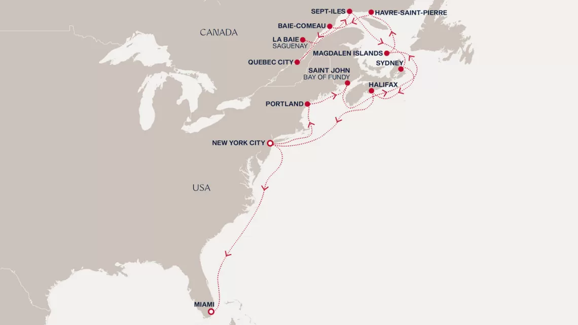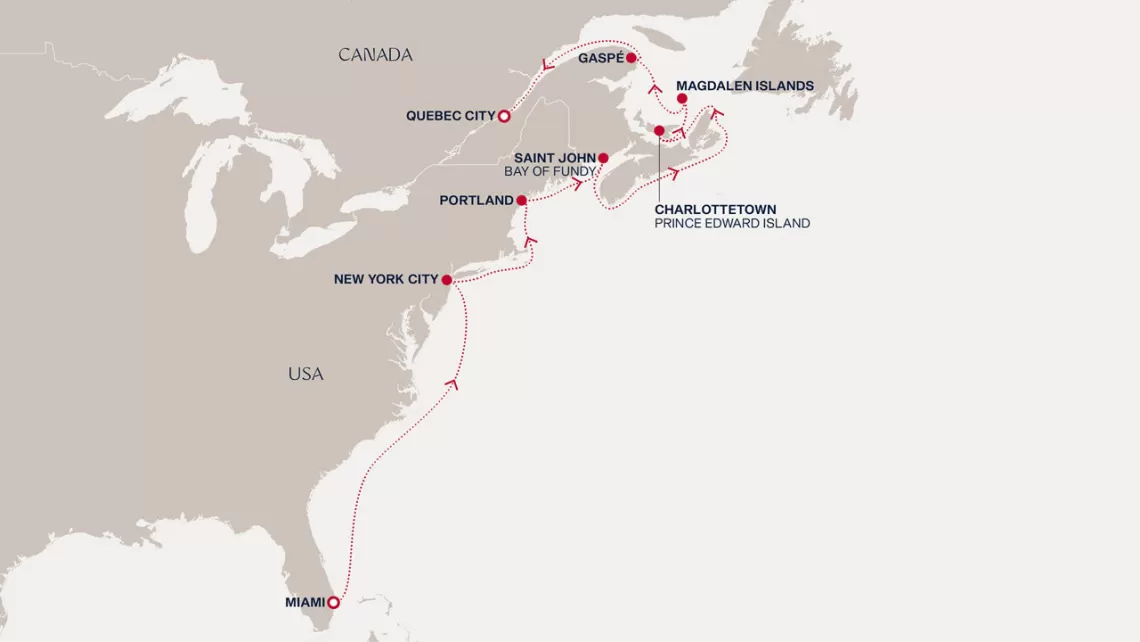Маршрут круиза: Нью-Йорк - море - Портленд - Сент-Джон - море - о. Мадлен - Авр-Сен-Пьер - Бэ-Комо - Квебек - Сагеней - Сет-Иль - море - Сидней - Галифакс - море - Нью-Йорк - море - море - Майами