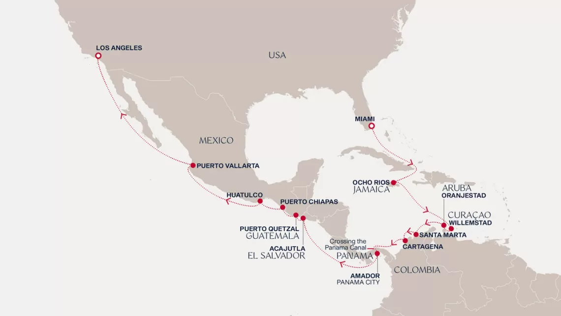 Маршрут круиза: Майами - море - Очо-Риос - море - Картахена - Колон - Лимон - море - о. Роатан - Белиз-Сити - море - Майами - море - море - Картахена - Панамский канал - Колон - Панамский канал - море - море - Уатулько - море - море - Кабо-Сан-Лукас - море - Сан-Диего - Лос-Анджелес - море - море - море - Сиэтл