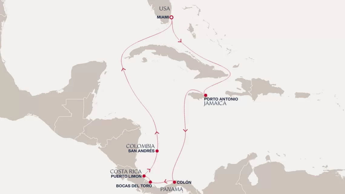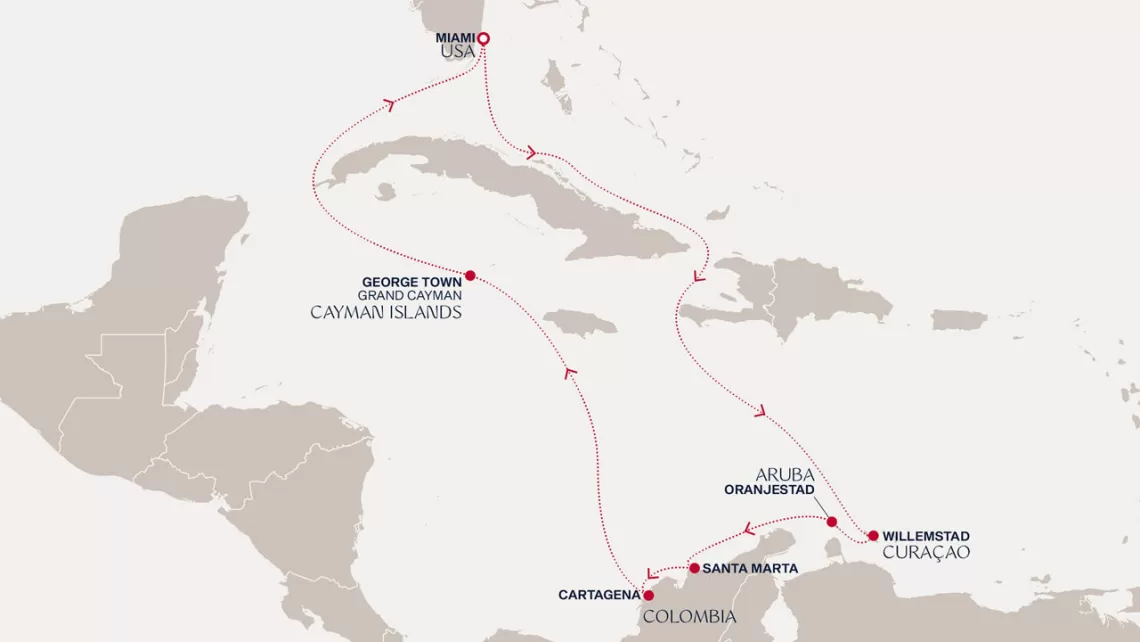 Маршрут круиза: Майами - море - Очо-Риос - море - Картахена - Колон - Лимон - море - о. Роатан - Белиз-Сити - море - Майами - море - море - Виллемстад, о. Кюрасао - Кралендейк, о. Бонэйр - Ораньестад, о. Аруба - море - Кабо Рохо - Очо-Риос - море - Майами