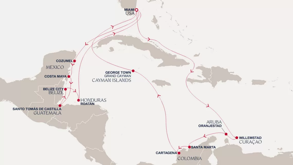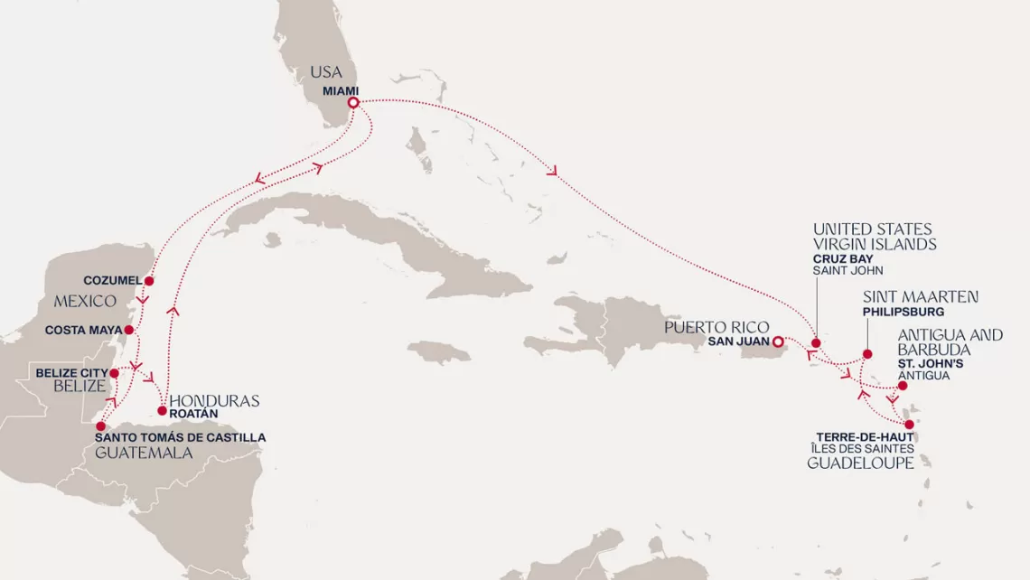 Маршрут круиза: Майами - море - Косумель - Белиз-Сити - Санто-Томас-де-Кастилья - море - Ки-Уэст - Майами - море - море - Шарлотта-Амалия, о. Сент-Томас - Пуант-а-Питр, о. Гваделупа - Сен-Пьер, о. Мартиника - Кастри, о. Сент-Люсия - Сент-Джорджес, о. Гренада - Кингстаун, о. Сент-Винсент - Бриджтаун, о. Барбадос
