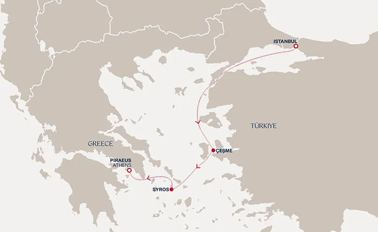 Маршрут круиза: Стамбул - Стамбул - Чешме - о. Сирос - Пирей / Афины