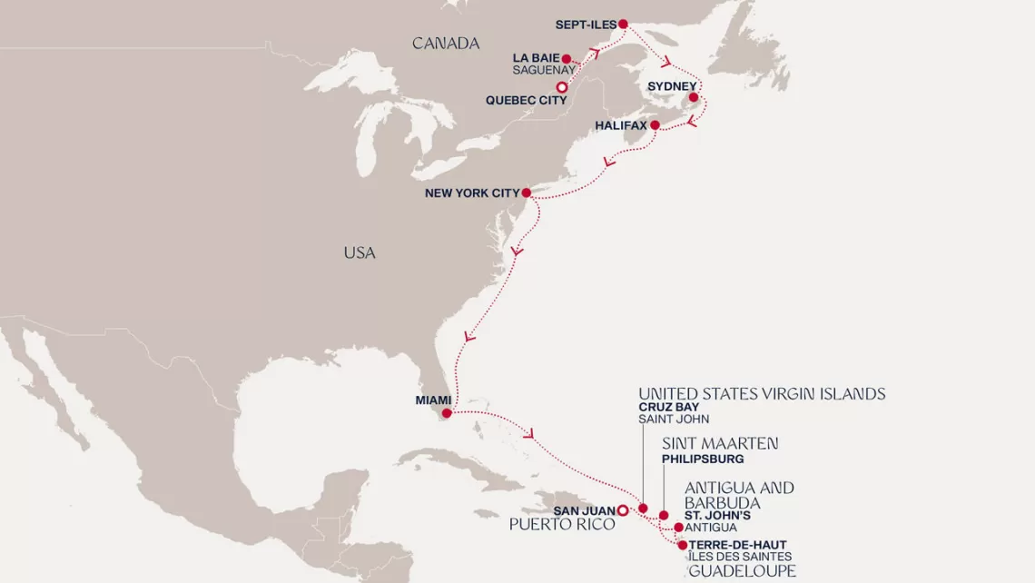 Маршрут круиза: Квебек - Сагеней - Сет-Иль - море - Сидней - Галифакс - море - Нью-Йорк - море - море - Майами - море - море - о. Сент-Джон - Сент-Джонс, о.Антигуа - о. Тер-де-О, Гваделупа - Филипсбург, о. Синт-Мартен - Сан-Хуан