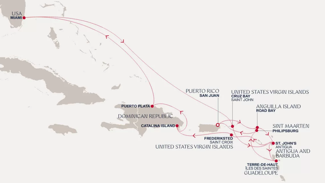Маршрут круиза: Майами - море - море - о. Сент-Джон - Сент-Джонс, о.Антигуа - о. Тер-де-О, Гваделупа - Филипсбург, о. Синт-Мартен - Сан-Хуан - Род-Таун, о. Тортола - Бастер, о. Сент-Китс - Густавия, о. Сен-Бартельми - Густавия, о. Сен-Бартельми - Роуд Бэй, о. Ангилья - море - море - Майами