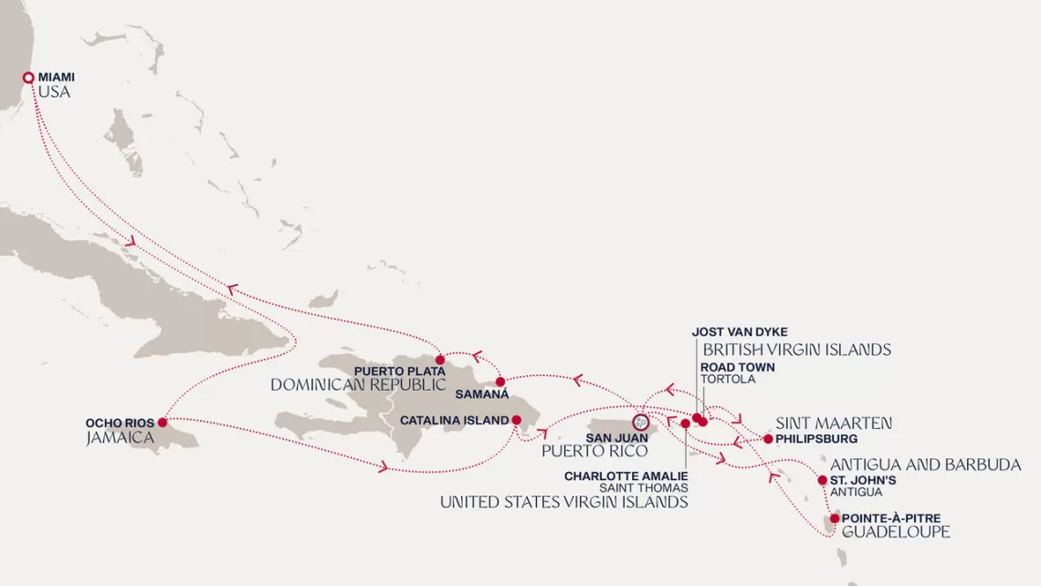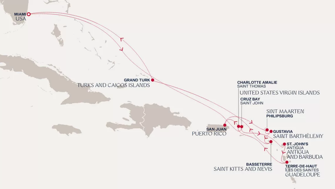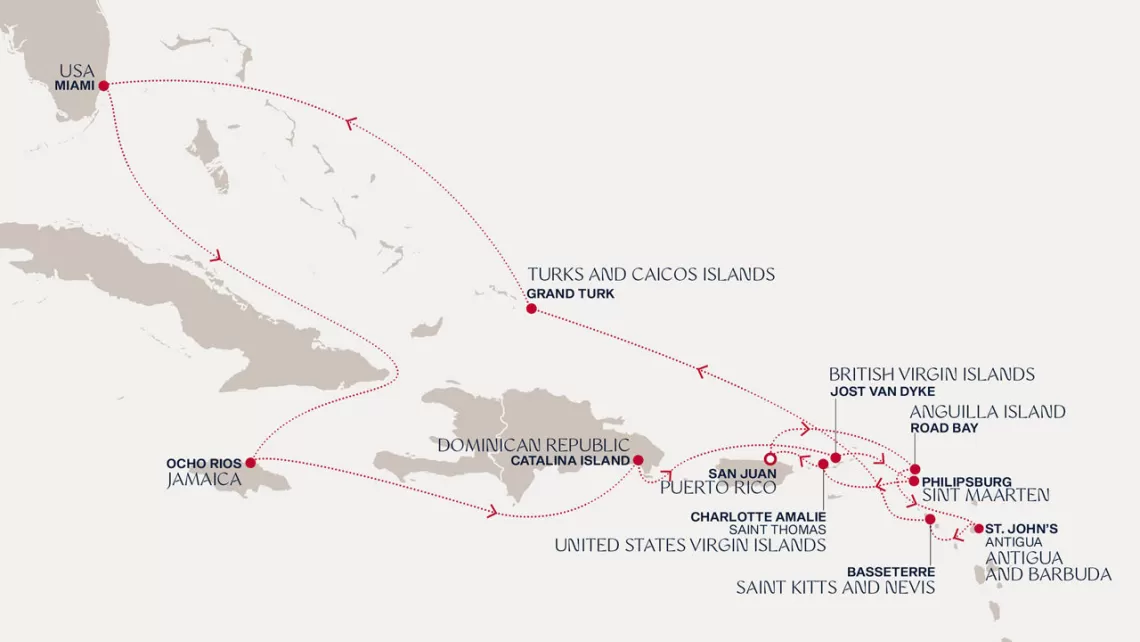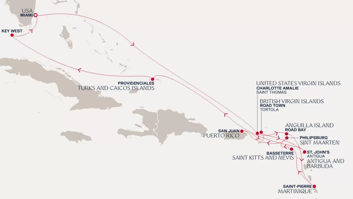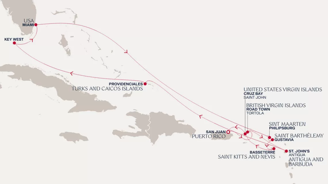 Маршрут круиза: Майами - море - море - о. Сент-Джон - Сент-Джонс, о.Антигуа - о. Тер-де-О, Гваделупа - Филипсбург, о. Синт-Мартен - Сан-Хуан - Род-Таун, о. Тортола - Бастер, о. Сент-Китс - Густавия, о. Сен-Бартельми - море - о. Гранд-Терк - море - Майами