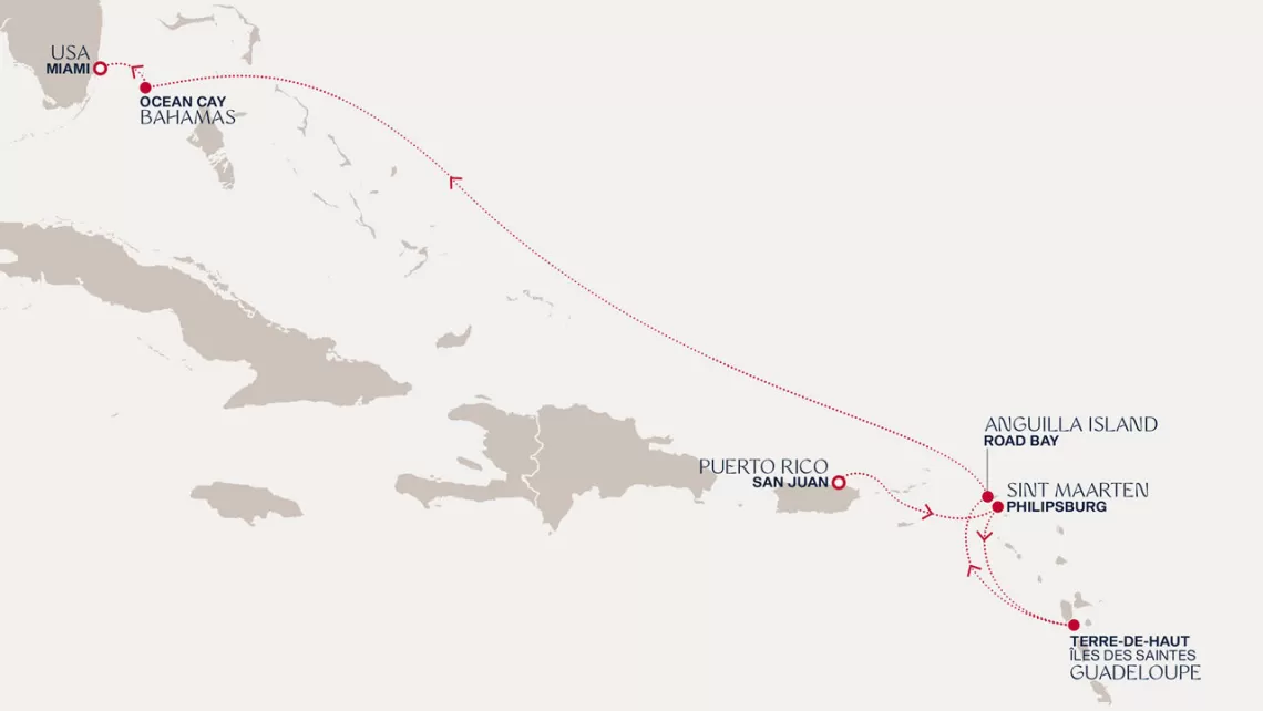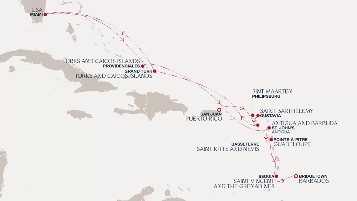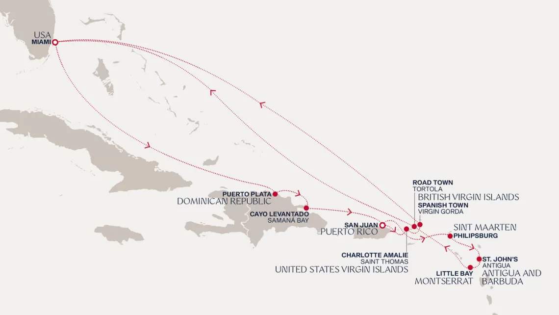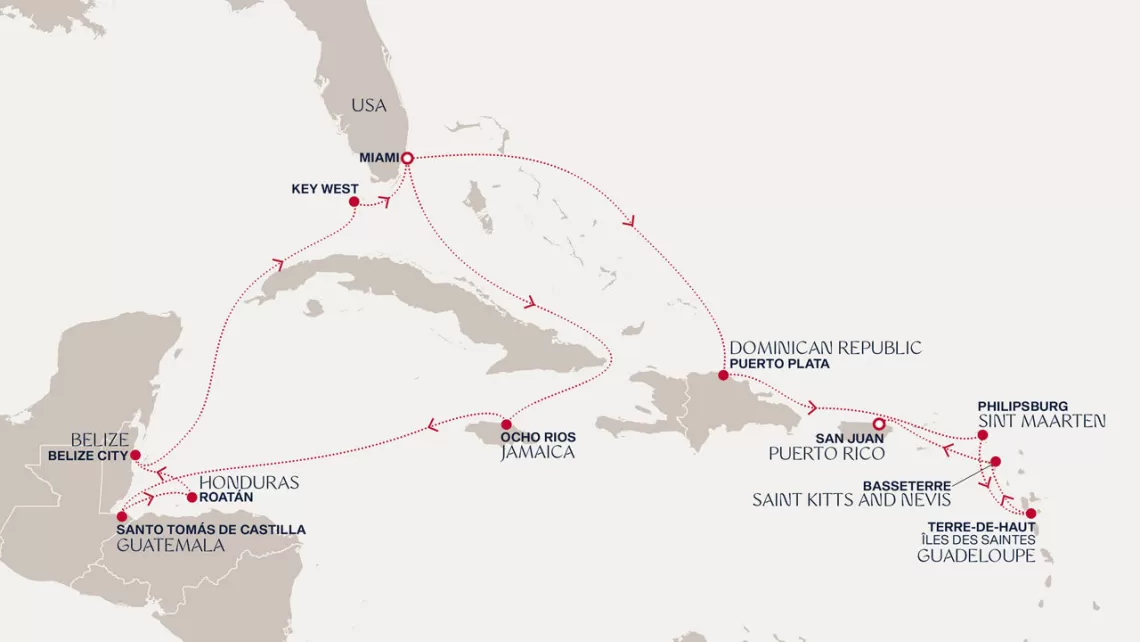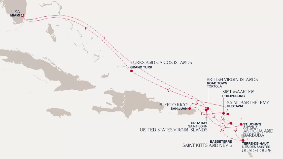 Маршрут круиза: Майами - море - море - о. Сент-Джон - Сент-Джонс, о.Антигуа - о. Тер-де-О, Гваделупа - Филипсбург, о. Синт-Мартен - Сан-Хуан - Род-Таун, о. Тортола - Бастер, о. Сент-Китс - Густавия, о. Сен-Бартельми - море - о. Гранд-Терк - море - Майами