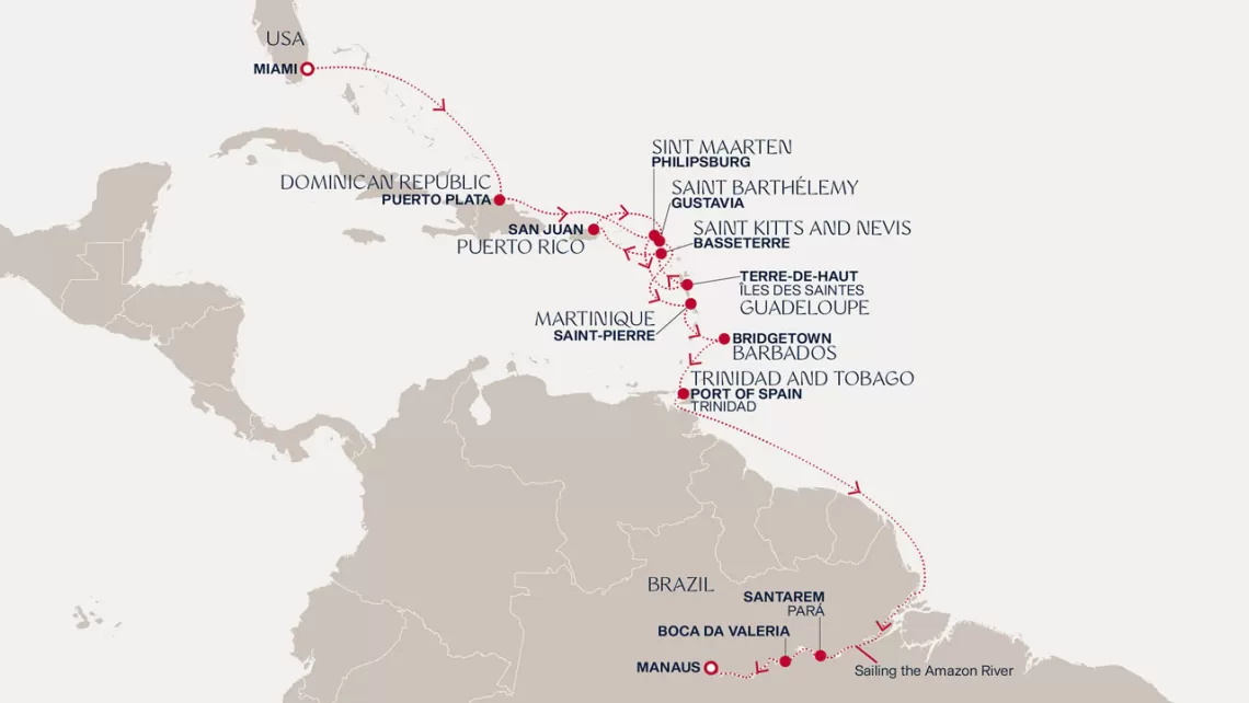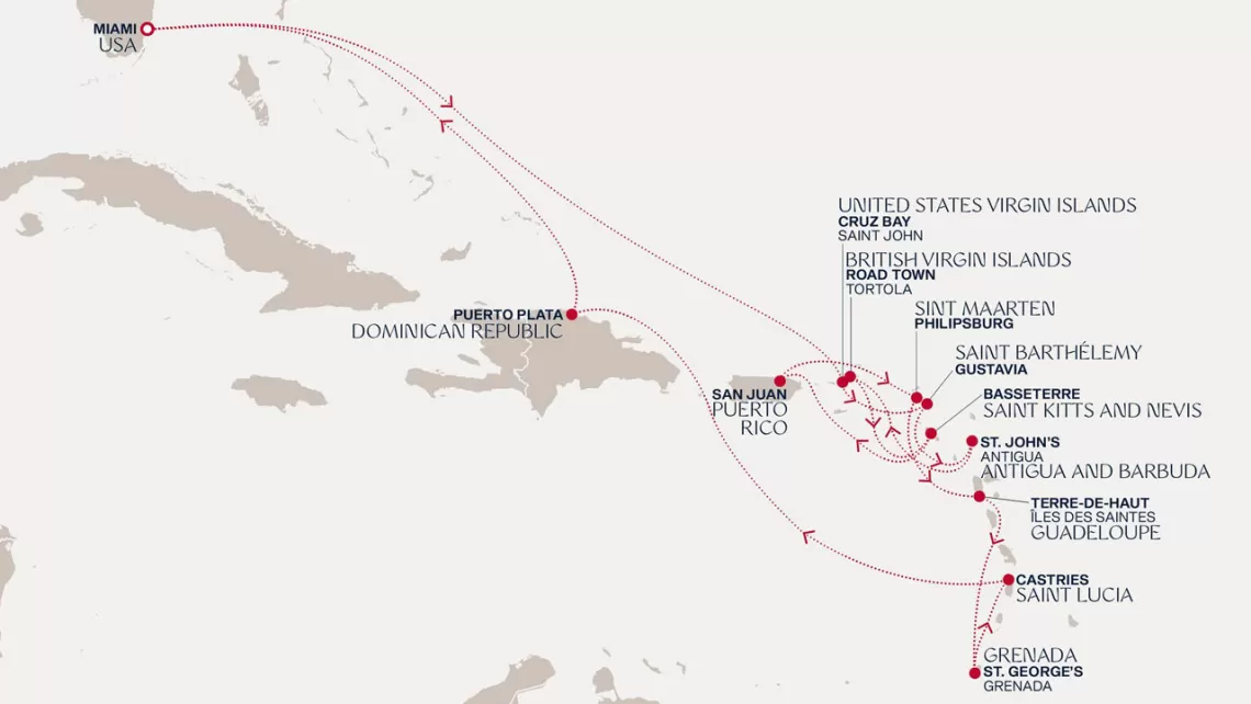 Маршрут круиза: Майами - море - море - о. Сент-Джон - Густавия, о. Сен-Бартельми - Сент-Джонс, о.Антигуа - Род-Таун, о. Тортола - Бастер, о. Сент-Китс - Сан-Хуан - Филипсбург, о. Синт-Мартен - о. Тер-де-О, Гваделупа - Сент-Джорджес, о. Гренада - Кастри, о. Сент-Люсия - море - Пуэрто-Плата - море - Майами