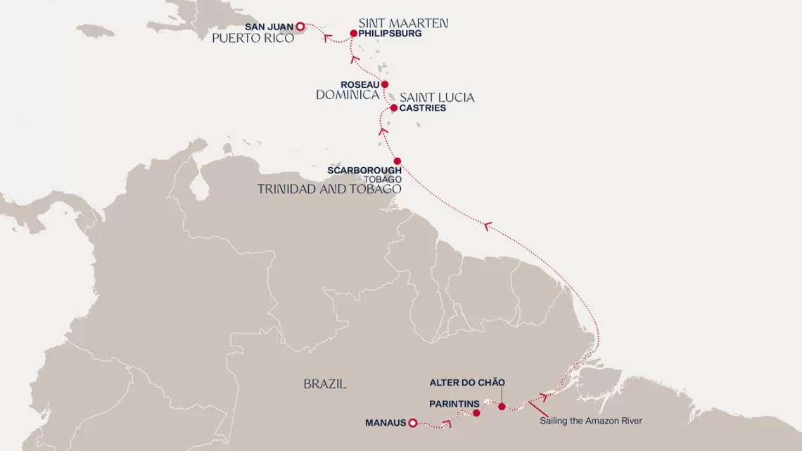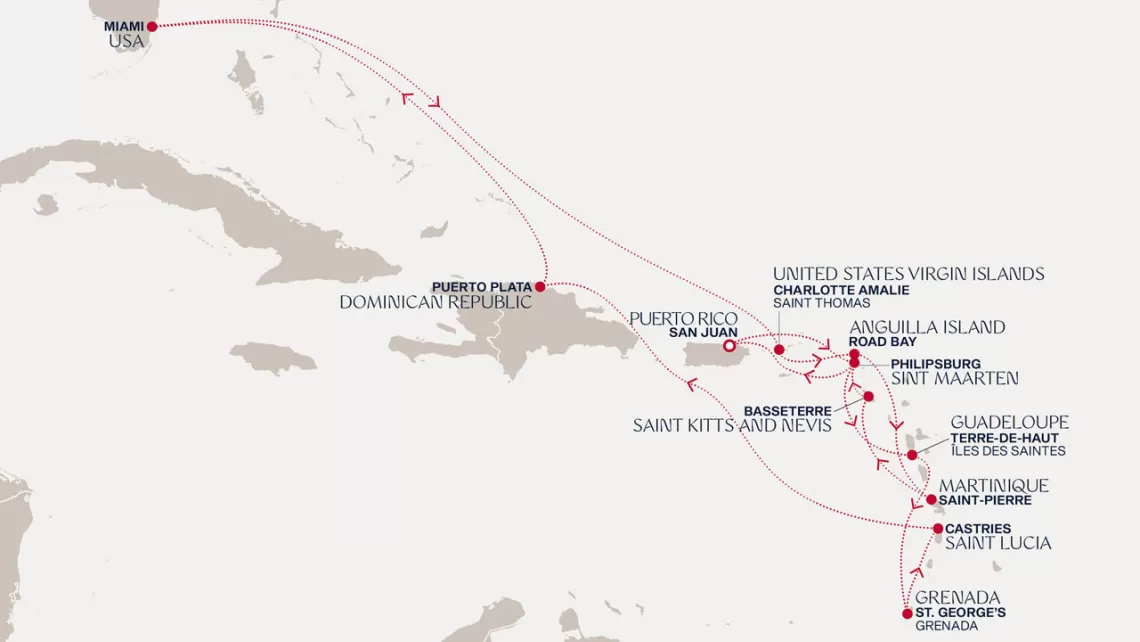 Маршрут круиза: Сан-Хуан - Филипсбург, о. Синт-Мартен - о. Тер-де-О, Гваделупа - Сент-Джорджес, о. Гренада - Кастри, о. Сент-Люсия - море - Пуэрто-Плата - море - Майами - море - море - Шарлотта-Амалия, о. Сент-Томас - Роуд Бэй, о. Ангилья - Сен-Пьер, о. Мартиника - Бастер, о. Сент-Китс - Филипсбург, о. Синт-Мартен - Сан-Хуан