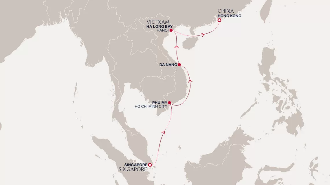Маршрут круиза: Гонконг - море - Халонг Бэй / Ханой - Халонг Бэй / Ханой - Дананг - море - Нячанг - Пхи Ми - Пхи Ми - море - Сингапур