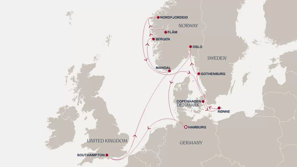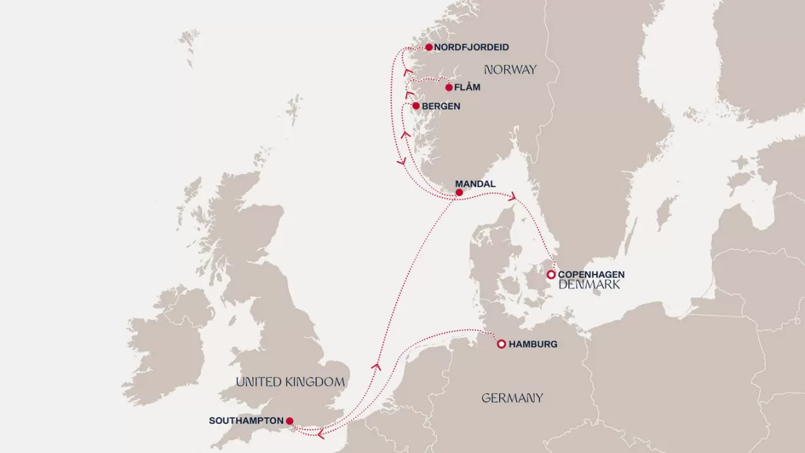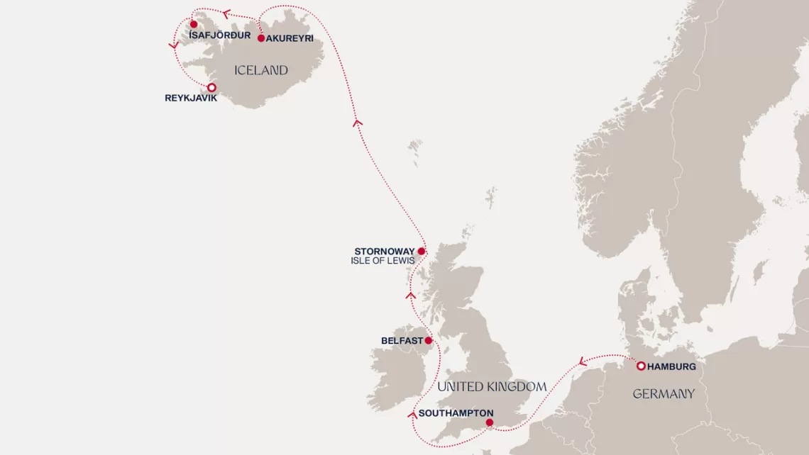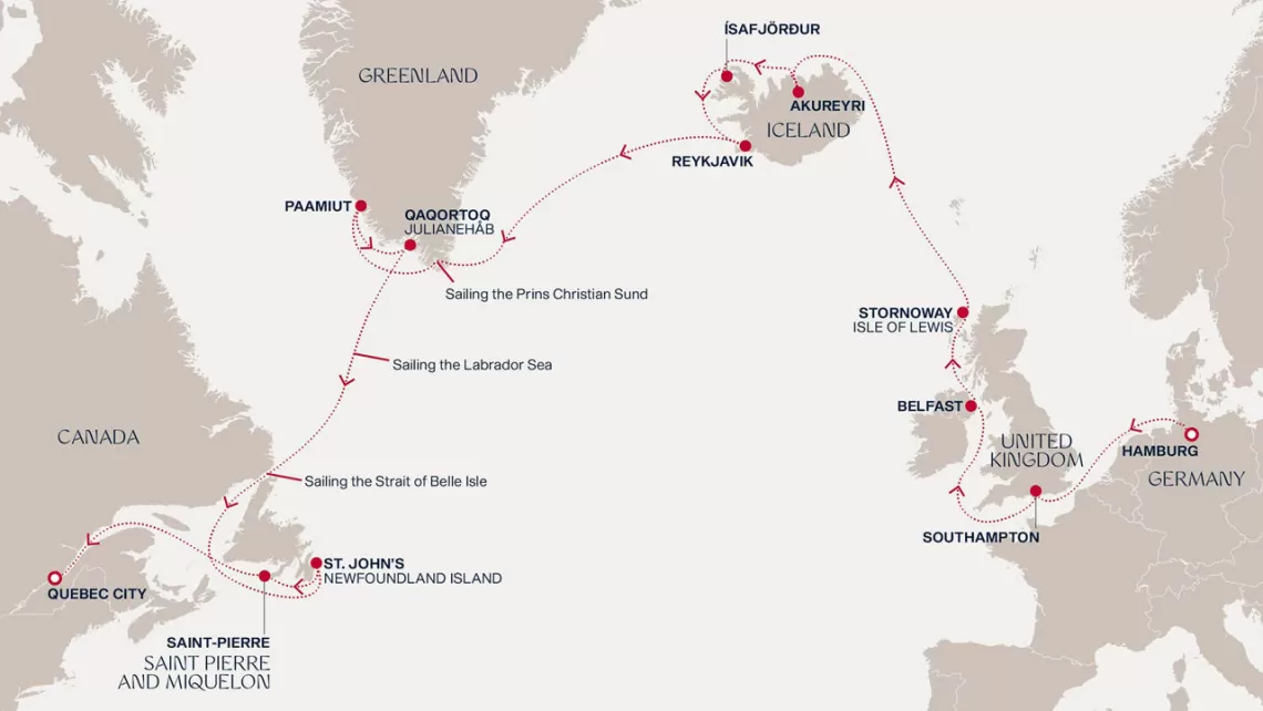Маршрут круиза: Бриджтаун, о. Барбадос - море - Кингстаун, о. Сент-Винсент - Сент-Джорджес, о. Гренада - Фор-де-Франс, о. Мартиника - Пуант-а-Питр, о. Гваделупа - Филипсбург, о. Синт-Мартен - море - море - море - море - море - Понта-Делгада, о.Сан-Мигел - море - море - море - море - Гамбург - море - Гавр / Париж - Саутгемптон / Лондон