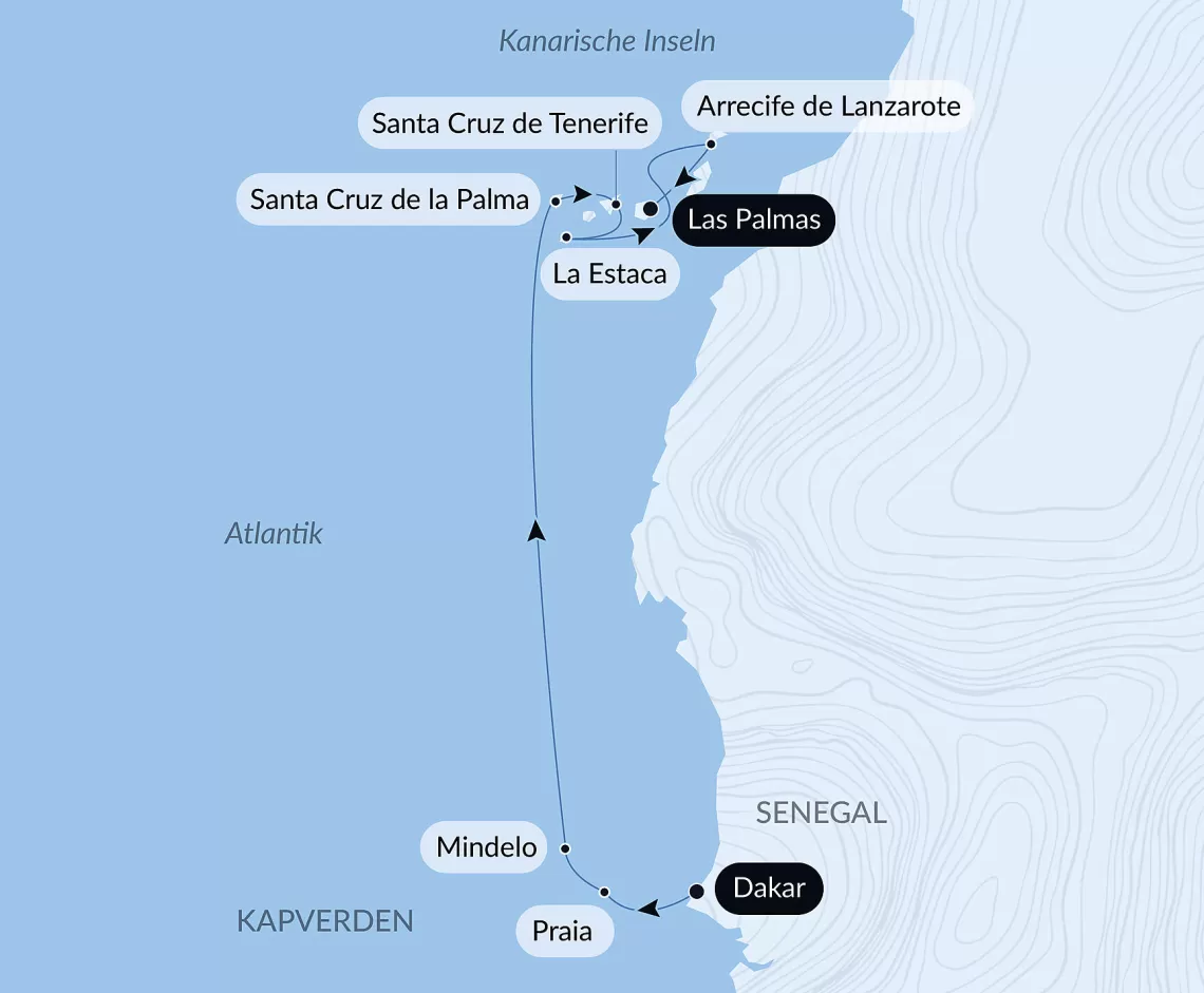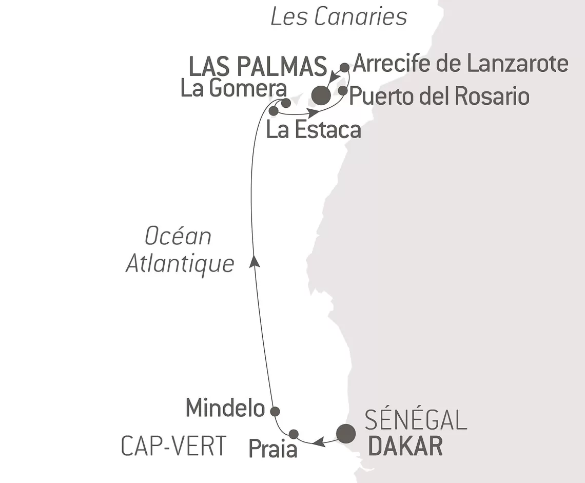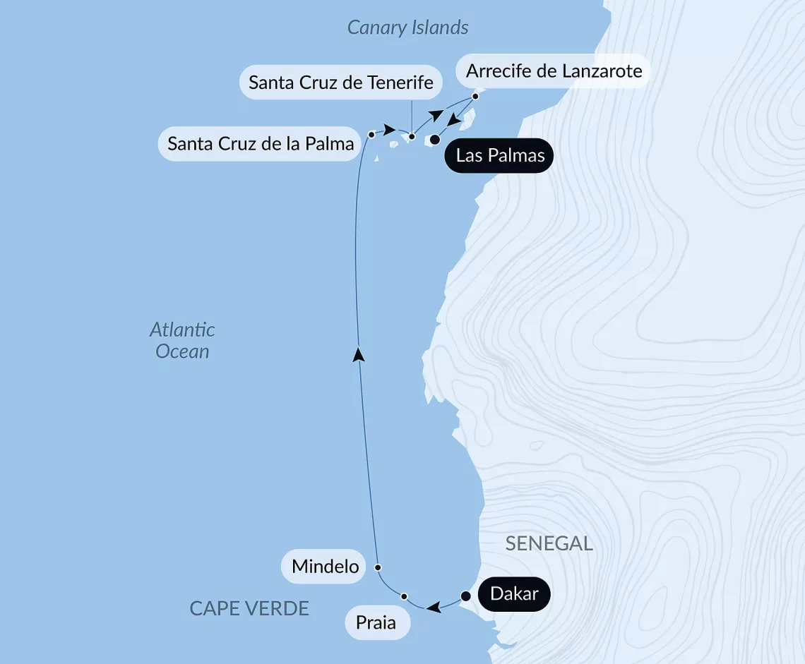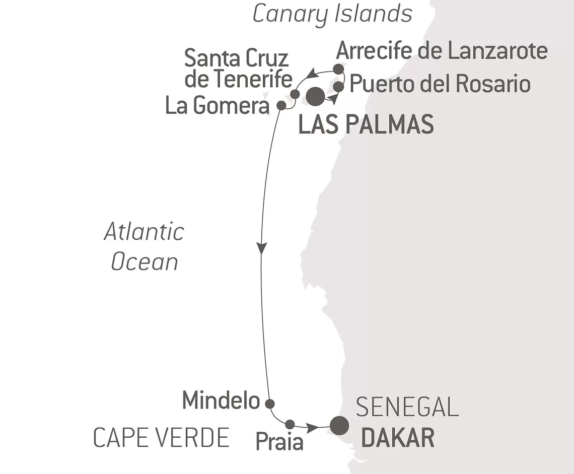 Маршрут круиза: Лас-Пальмас, о. Гран-Канария - Аресифи, о. Лансароте - Пуэрто-дель-Росарио, о. Фуэртевентура - Санта-Крус-де-Тенерифе, о. Тенерифе - Сан-Себастьян-де-ла-Гомера - море - море - Минделу, о. Сан-Висенте - Прая - море - Дакар