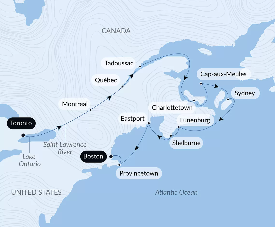 Маршрут круиза: Торонто - озеро Онтарио - Сент-Лоуренс река - Монреаль - Квебек - Тадуссак - море - Шарлоттаун - Кап-о-Мёль - Сидней - Луненберг - Шелберн - Истпорт - Провинстаун - Бостон