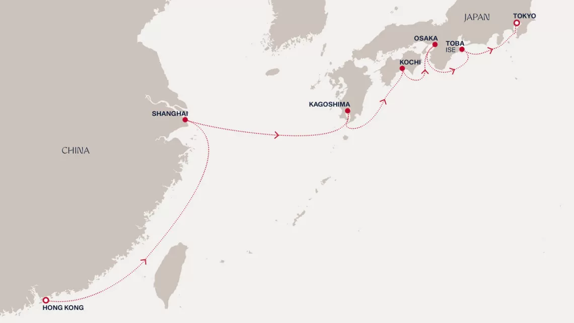 Маршрут круиза: Токио - море - Нагасаки - Пусан - море - Шанхай - море - море - Гонконг - море - Дананг - море - море - Сингапур - Порт-Кланг - Пенанг - море - море - море - море - море - море - Виктория, о. Маэ - море - море - Порт-Луи - Порт-Луи - Ля Посьон - море - море - море - море - море - Кейптаун - Кейптаун - море - море - Уолфиш-Бэй - море - море - море - море - море - море - море - Минделу, о. Сан-Висенте - море - море - море - море - море - Чивитавеккья / Рим - Ливорно / Флоренция, Пиза - Генуя / Милан - Марсель