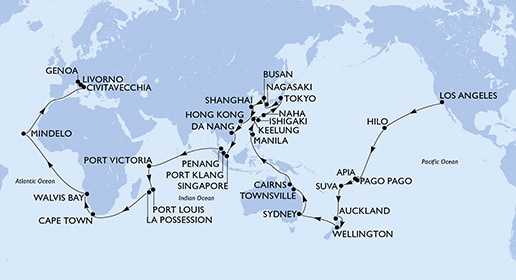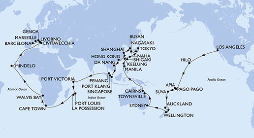 Маршрут круиза: Чивитавеккья / Рим - Генуя / Милан - Марсель - Барселона - море - море - Фуншал, о. Мадейра - море - море - море - море - море - Бриджтаун, о. Барбадос - Сент-Джорджес, о. Гренада - море - Виллемстад, о. Кюрасао - море - Картахена - море - Лимон - Панамский канал - Панамский канал - море - Пунтаренас - море - Пуэрто-Кетсаль - море - море - Пуэрто Вальярта - Кабо-Сан-Лукас - море - Сан-Диего - море - Лос-Анджелес - Лос-Анджелес - море - море - море - море - Хило, о. Биг-Айленд - море - море - море - море - море - Паго-Паго, о. Тутуила - море - Апиа, о. Уполу - море - Сува, о. Вити-Леву - море - море - Окленд - Окленд - море - Веллингтон - море - море - море - Сидней - Сидней - море - море - море - Таунсвилл - Таунсвилл - Кэрнс - Кэрнс - море - море - море - море - море - Манила, о. Лусон - Манила, о. Лусон - море - Цзилун - Исигаки, о-ва Сакисима - Наха - море - море - Токио - Токио - море - Нагасаки - Пусан - море - Шанхай - море - море - Гонконг - море - Дананг - море - море - Сингапур - Порт-Кланг - Пенанг - море - море - море - море - море - море - Виктория, о. Маэ - море - море - Порт-Луи - Порт-Луи - Ля Посьон - море - море - море - море - море - Кейптаун - Кейптаун - море - море - Уолфиш-Бэй - море - море - море - море - море - море - море - Минделу, о. Сан-Висенте - море - море - море - море - море - Чивитавеккья / Рим