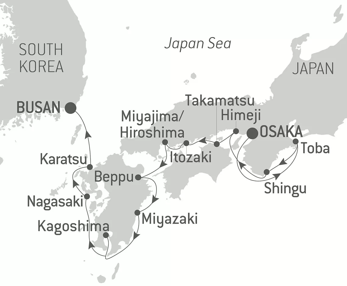 Маршрут круиза: Осака - Тоба - Сингу - Химэдзи - Такамацу - Михора - Хиросима - о. Ицукусима - Беппу - Миядзаки - Кагосима - Карацу - Нагасаки - Пусан