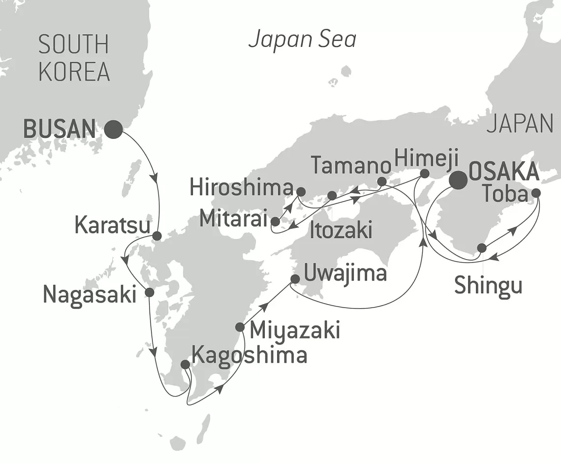 Маршрут круиза: Пусан - Карацу - Нагасаки - Кагосима - Миядзаки - Увадзима - Тамано - Митарай - Ономити - Хиросима - о. Ицукусима - Химэдзи - Сингу - Тоба - Осака