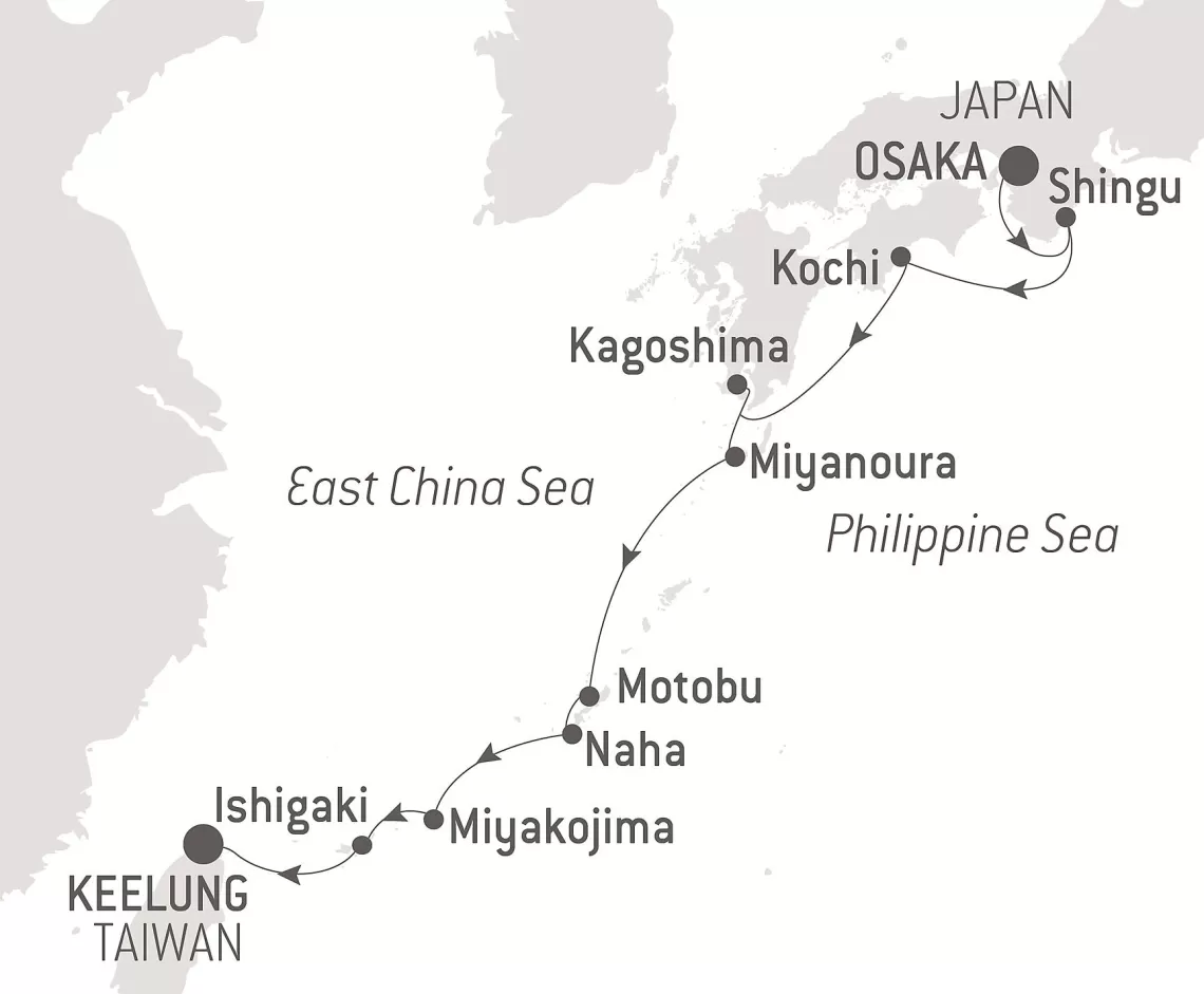 Маршрут круиза: Осака - Сингу - Коти - Кагосима - Мияноура - Мотобу, о. Окинава - Наха - Миякодзима - Исигаки, о-ва Сакисима - Цзилун