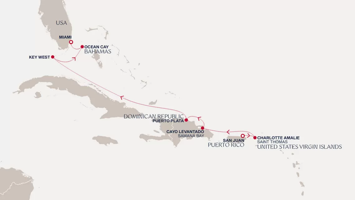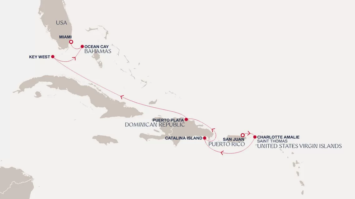 Маршрут круиза: Майами - море - Провиденсьялес - Пуэрто-Плата - Ла-Романа - о. Йост-Ван-Дайк - Густавия, о. Сен-Бартельми - Сан-Хуан - Роуд Бэй, о. Ангилья - Сент-Джонс, о.Антигуа - Фредерикстед, о. Санта-Крус - о. Каталина - Пуэрто-Плата - море - Майами