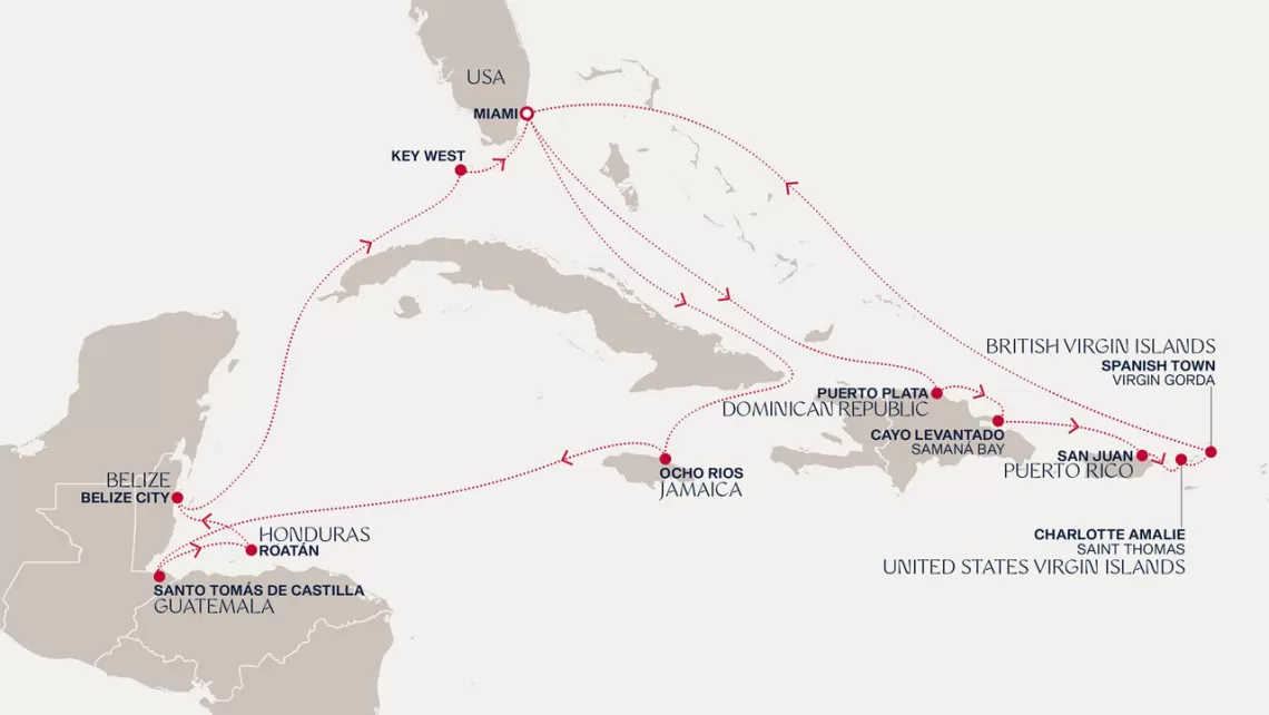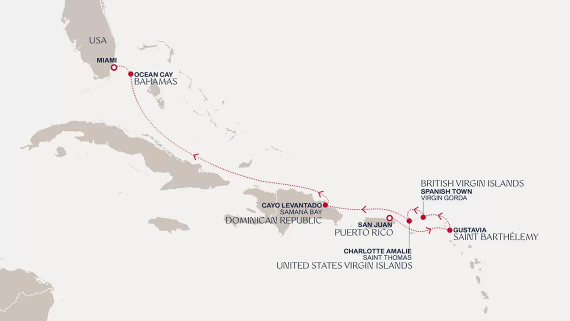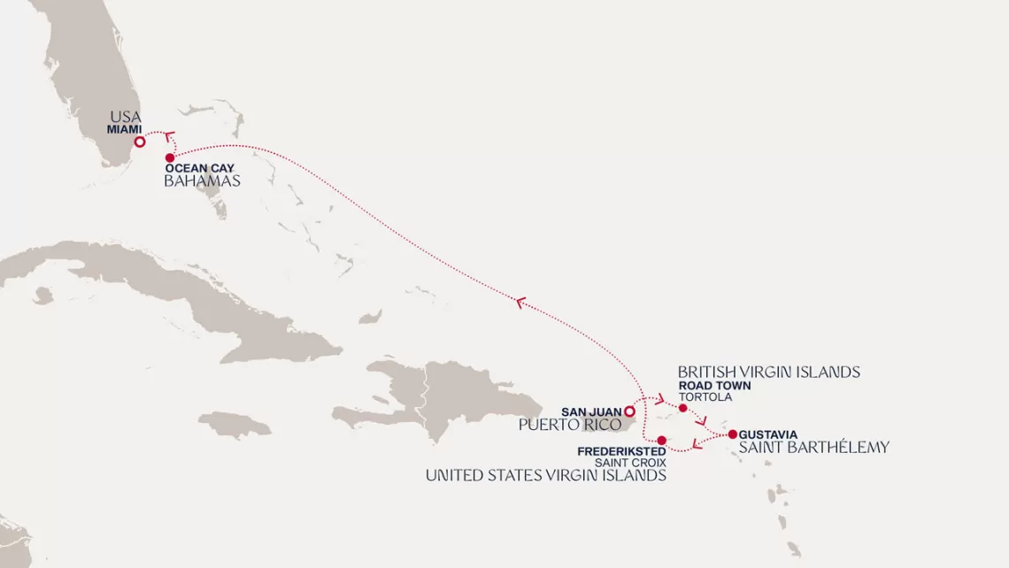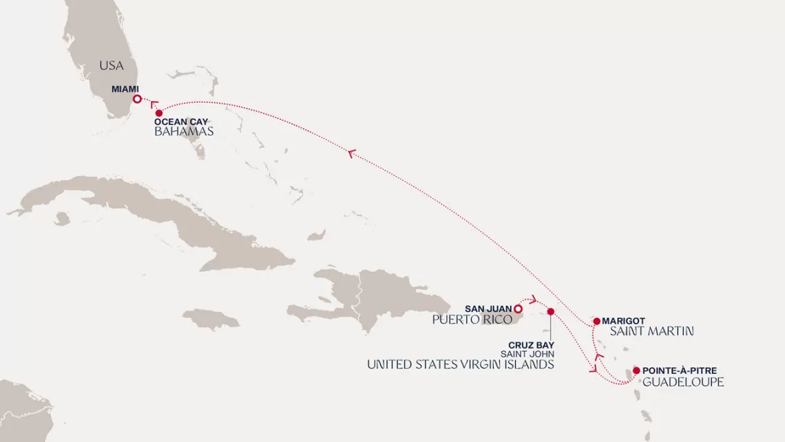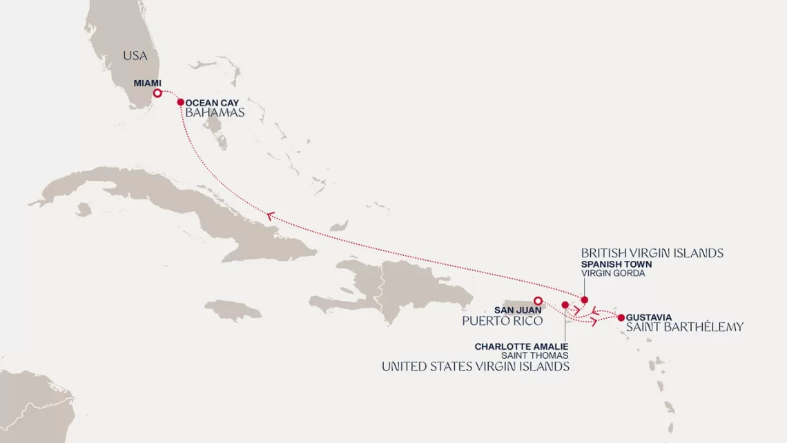 Маршрут круиза: Майами - море - море - о. Сент-Джон - Сент-Джонс, о.Антигуа - о. Тер-де-О, Гваделупа - Филипсбург, о. Синт-Мартен - Сан-Хуан - Род-Таун, о. Тортола - Бастер, о. Сент-Китс - Густавия, о. Сен-Бартельми - море - о. Гранд-Терк - море - Майами