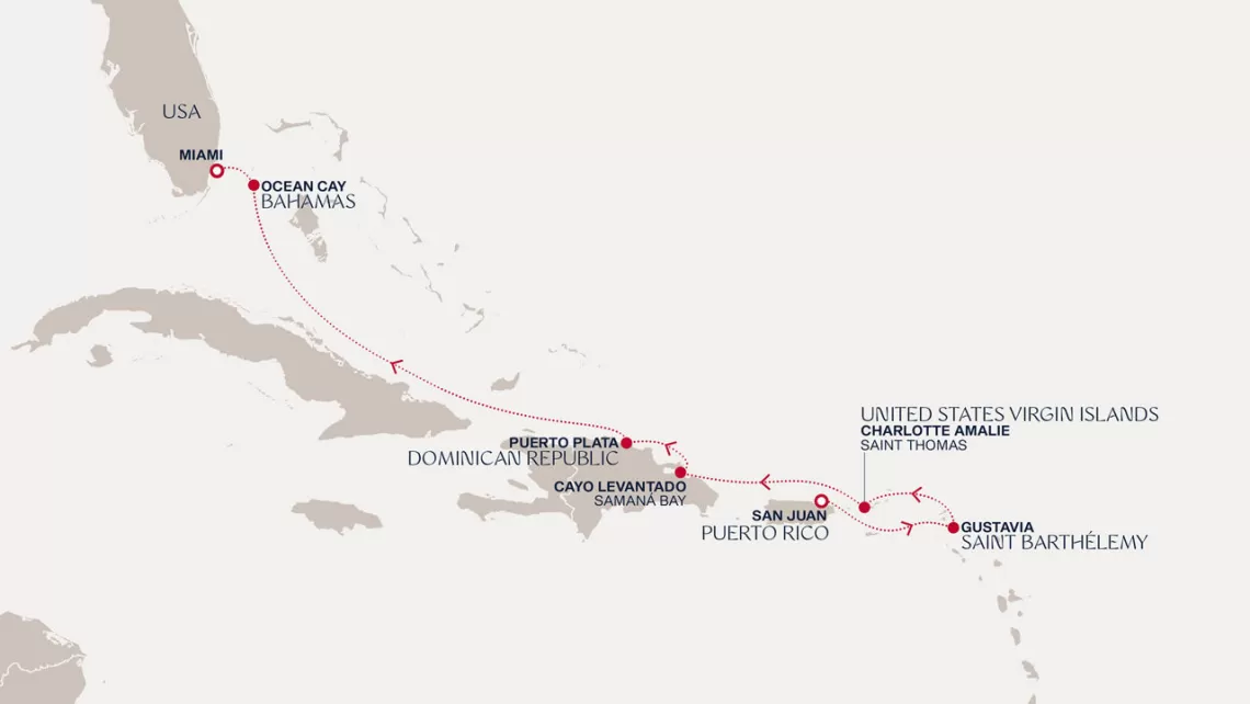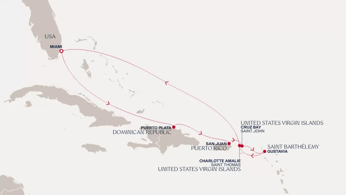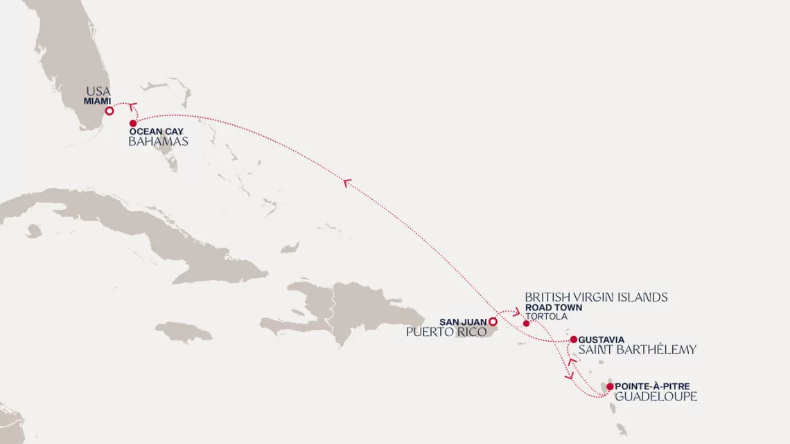 Маршрут круиза: Майами - море - море - о. Сент-Джон - Сент-Джонс, о.Антигуа - о. Тер-де-О, Гваделупа - Густавия, о. Сен-Бартельми - Сан-Хуан - Роуд Бэй, о. Ангилья - Сент-Джонс, о.Антигуа - Бастер, о. Сент-Китс - море - о. Гранд-Терк - море - Майами