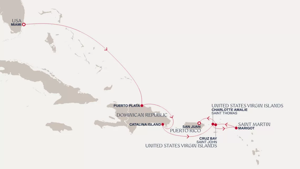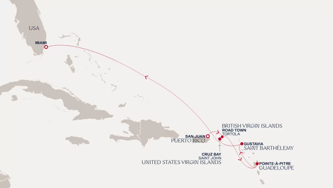 Маршрут круиза: Майами - море - море - о. Сент-Джон - Сент-Джонс, о.Антигуа - о. Тер-де-О, Гваделупа - Филипсбург, о. Синт-Мартен - Сан-Хуан - Род-Таун, о. Тортола - Бастер, о. Сент-Китс - Густавия, о. Сен-Бартельми - Густавия, о. Сен-Бартельми - Роуд Бэй, о. Ангилья - море - море - Майами