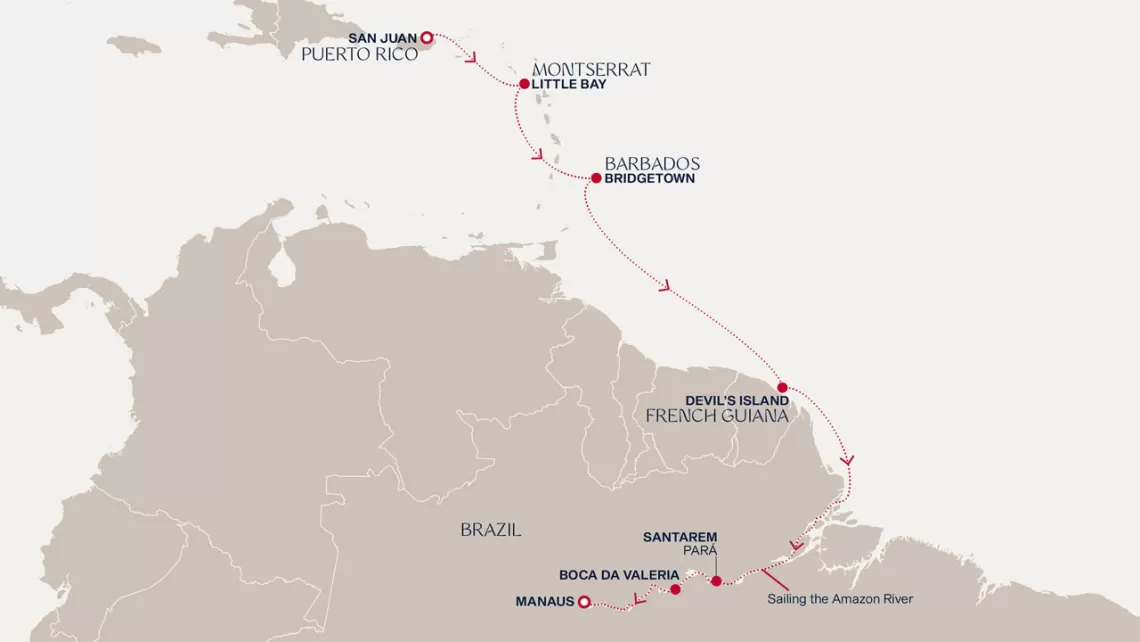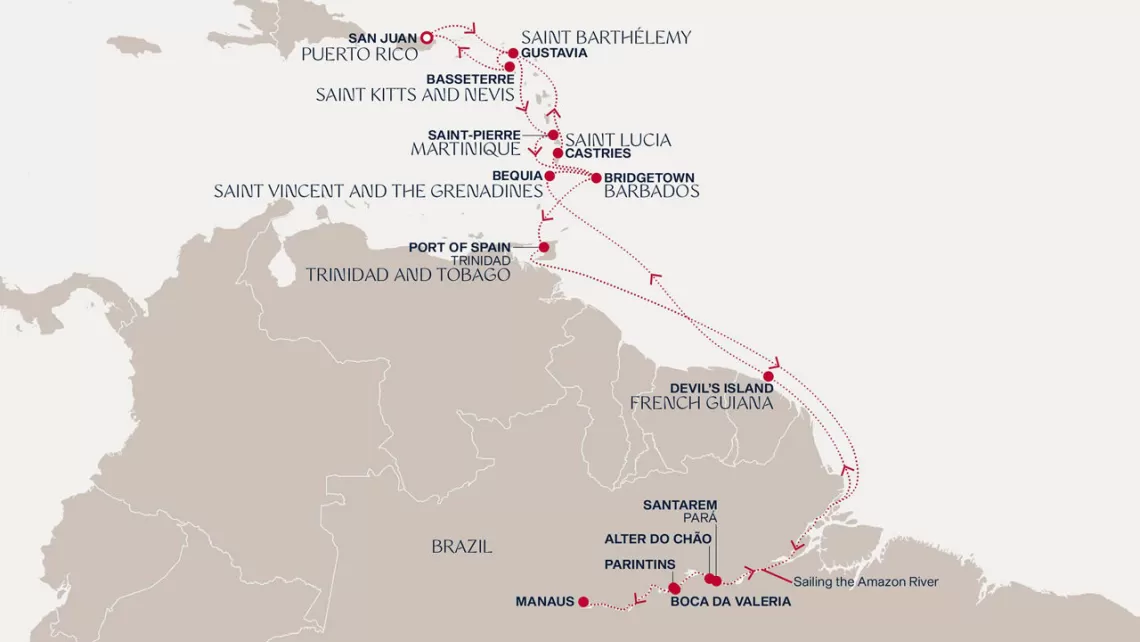 Маршрут круиза: Сан-Хуан - Род-Таун, о. Тортола - Бастер, о. Сент-Китс - Густавия, о. Сен-Бартельми - море - о. Гранд-Терк - море - Майами - море - море - о. Сент-Джон - Сент-Джонс, о.Антигуа - о. Тер-де-О, Гваделупа - Густавия, о. Сен-Бартельми - Сан-Хуан