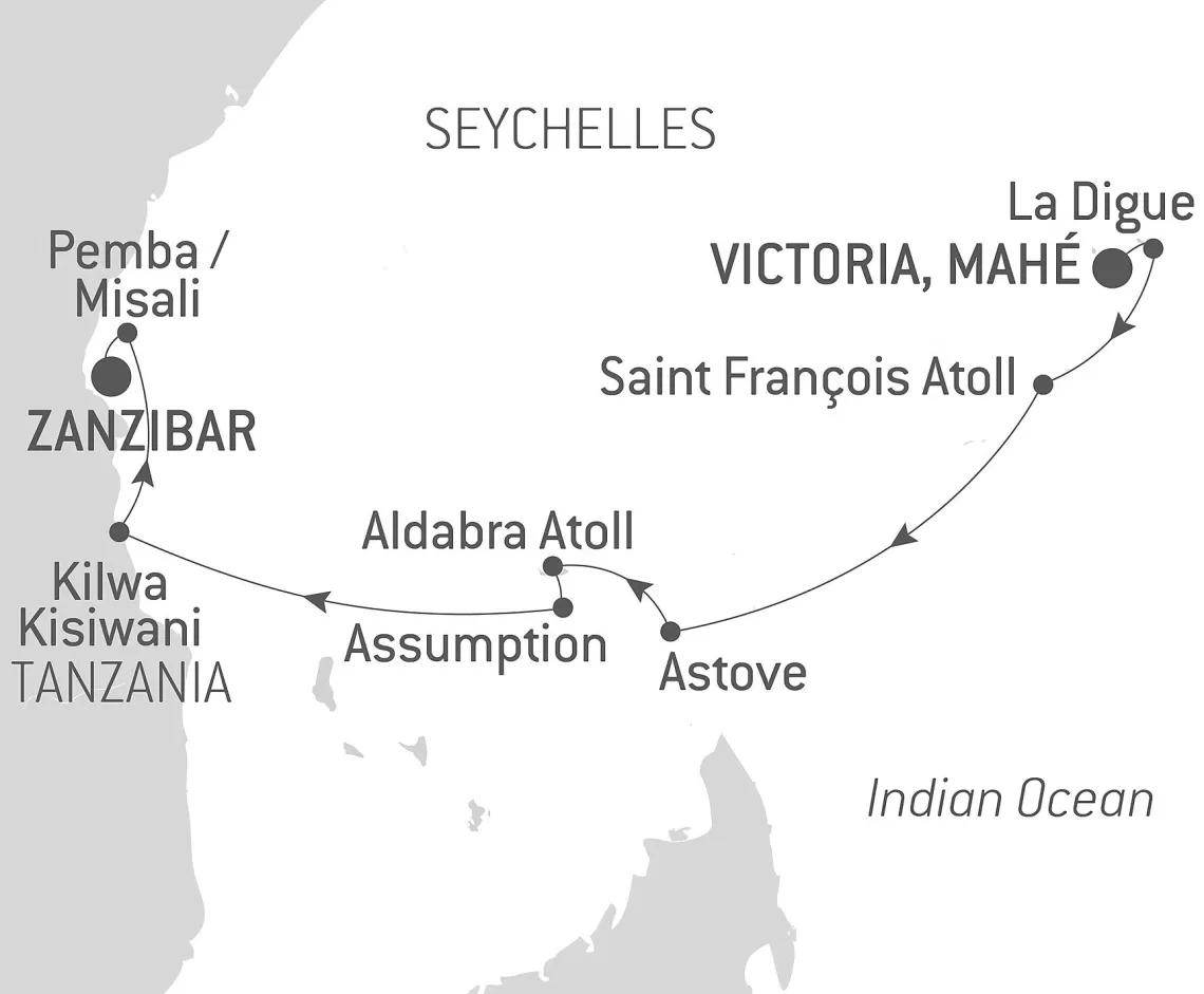 Маршрут круиза: Виктория, о. Маэ - о. Ла-Диг - остров Сен-Франсуа - море - о. Астов - о. Альдабра - о. Альдабра - о. Ассампшен - море - Килва-Кисивани, о. Килва - о. Пемба, Занзибар - о. Мисали - Занзибар