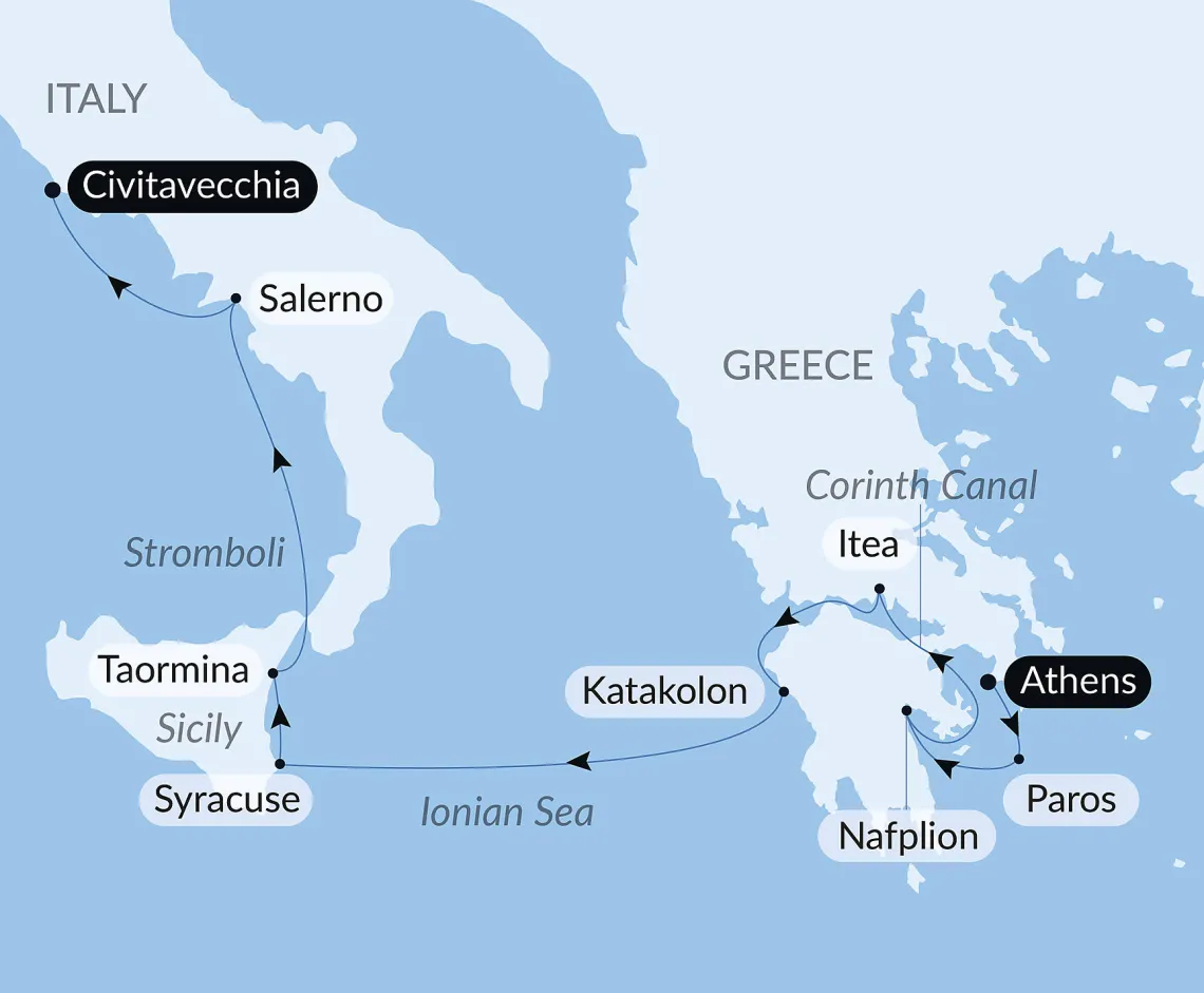Маршрут круиза: Валлетта - Порт Эмпедокле, о. Сицилия - Трапани, о. Сицилия - Палермо, о. Сицилия - о. Липари - о. Стромболи - Салерно - Реджо-ди-Калабрия - Таормина, о. Сицилия - Сиракузы, о. Сицилия - Валлетта