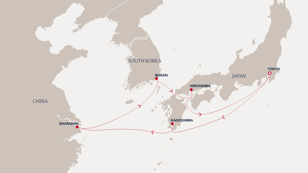 Маршрут круиза: Токио - море - Кагосима - море - Шанхай - Шанхай - Пусан - Хиросима - море - Токио