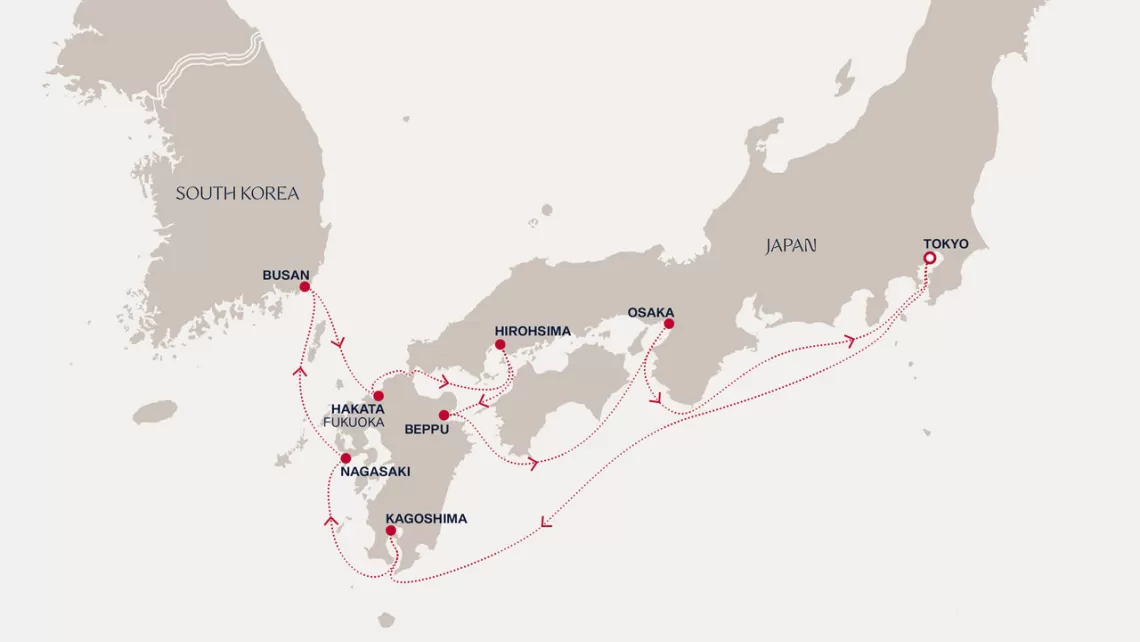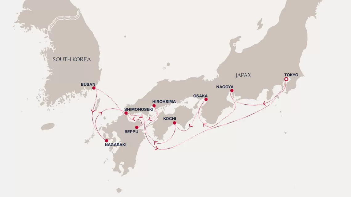 Маршрут круиза: Токио - Нагоя - Осака - Коти - Хиросима - Беппу - Пусан - Нагасаки - Симоносеки - море - Токио