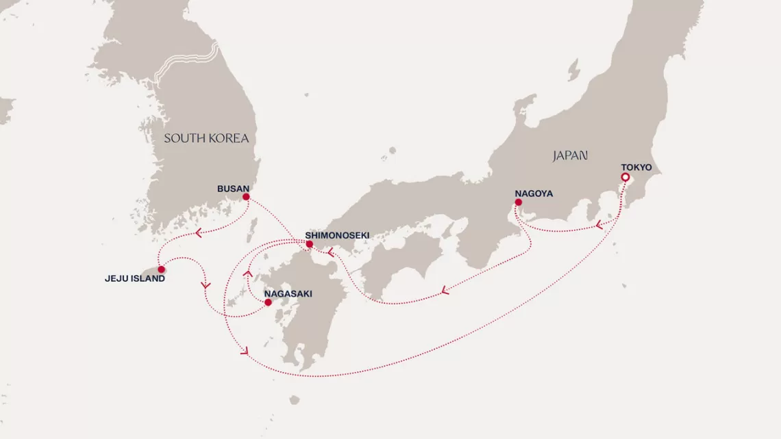 Маршрут круиза: Токио - Нагоя - море - Пусан - Чеджудо - Нагасаки - Симоносеки - море - Токио