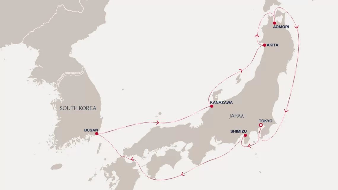 Маршрут круиза: Токио - Симидзу - море - Пусан - море - Канадзава - Акита - Аомори - море - Токио