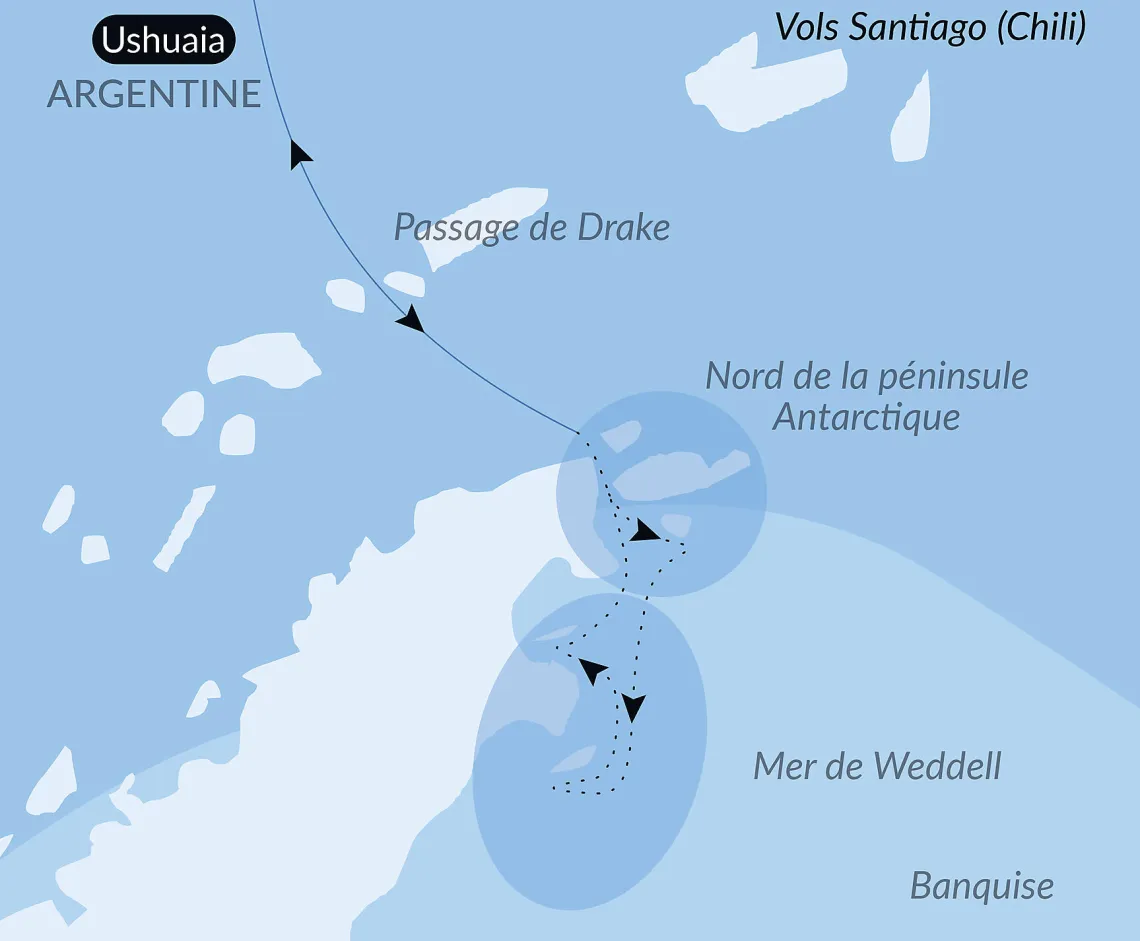Маршрут круиза: Ушуайя - пролив Дрейка - пролив Дрейка - Антарктический полуостров - Антарктический полуостров - Море Уэдделла - Море Уэдделла - Антарктический полуостров - Море Уэдделла - Море Уэдделла - пролив Дрейка - пролив Дрейка - Ушуайя