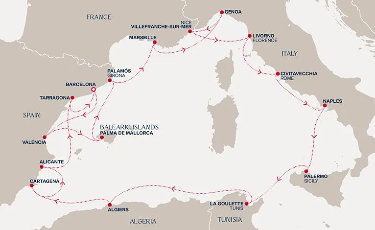 Маршрут круиза: Чивитавеккья / Рим - Неаполь / Помпеи - Палермо, о. Сицилия - Ла-Гулетт - море - Алжир - Картахена - Аликанте - Таррагона - Барселона - море - Танжер - Касабланка - Касабланка - Агадир - Аресифи, о. Лансароте - Сан-Себастьян-де-ла-Гомера - Санта-Крус-де-Тенерифе, о. Тенерифе - Фуншал, о. Мадейра - Фуншал, о. Мадейра - море - Лиссабон