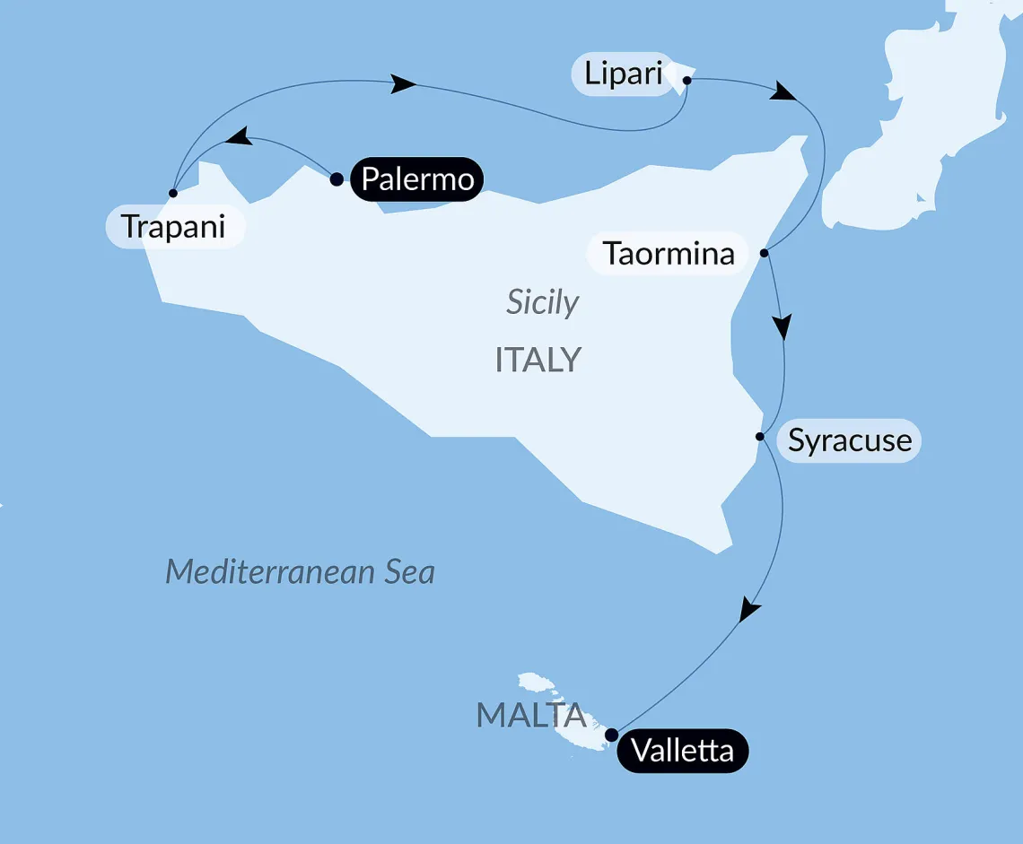 Маршрут круиза: Валлетта - Порт Эмпедокле, о. Сицилия - Трапани, о. Сицилия - Палермо, о. Сицилия - о. Липари - о. Стромболи - Реджо-ди-Калабрия - Сиракузы, о. Сицилия - Таормина, о. Сицилия - Валлетта