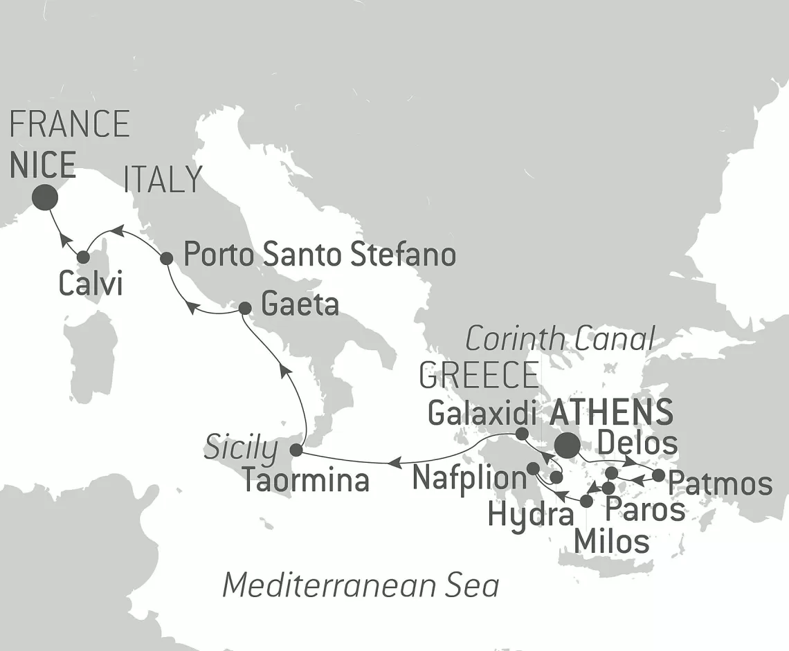Маршрут круиза: Пирей / Афины - о. Патмос - о. Делос - о. Парос - о. Милос - Нафплион - о. Идра - Коринфский канал - Галаксиди / Дельфы - море - Таормина, о. Сицилия - Гаэта - Порто Санто Стефано - Кальви, о. Корсика - Ницца