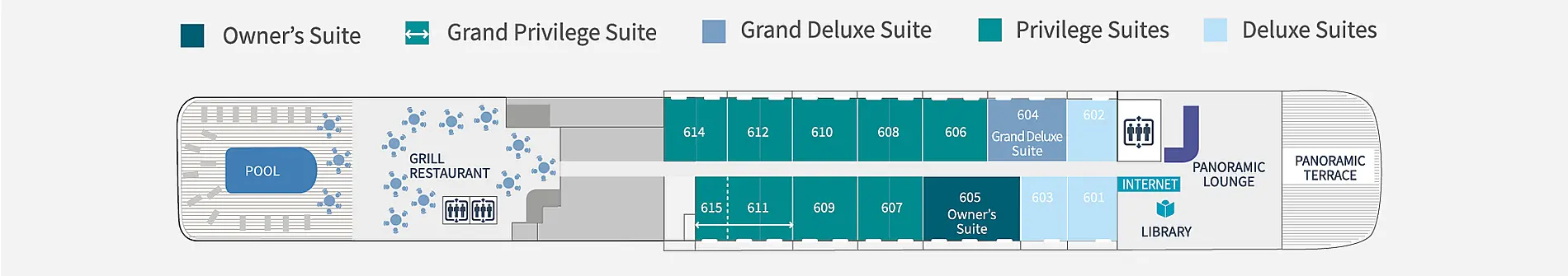 Расположение каюты можно посмотреть на плане палуб во вкладке "Круизный лайнер" на странице выше. Первые цифры номера каюты - номер палубы. Каюты отмеченные "для инвалидов" могут быть заменены MSC на каюту той же категории с другим расположением на лайнере без согласования с Клиентом.
