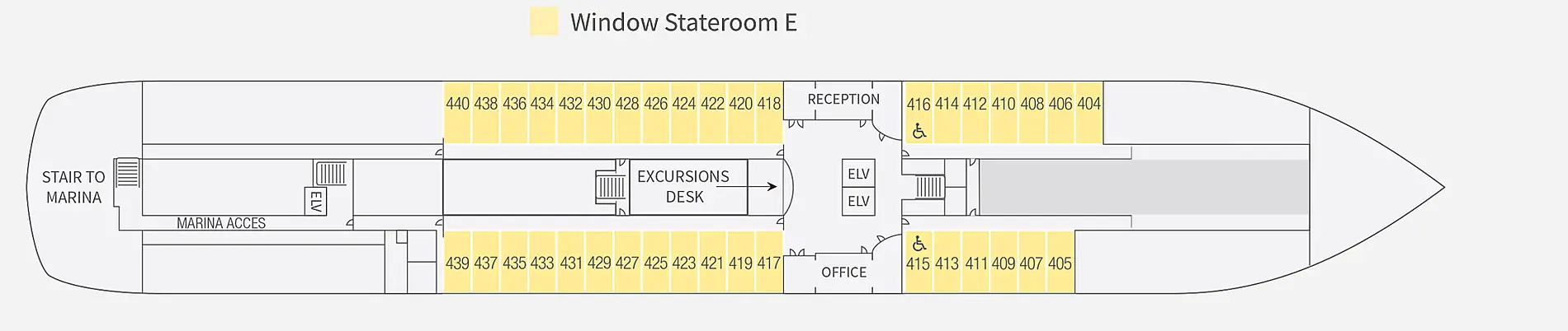 Расположение каюты можно посмотреть на плане палуб во вкладке "Круизный лайнер" на странице выше. Первые цифры номера каюты - номер палубы. Каюты отмеченные "для инвалидов" могут быть заменены MSC на каюту той же категории с другим расположением на лайнере без согласования с Клиентом.