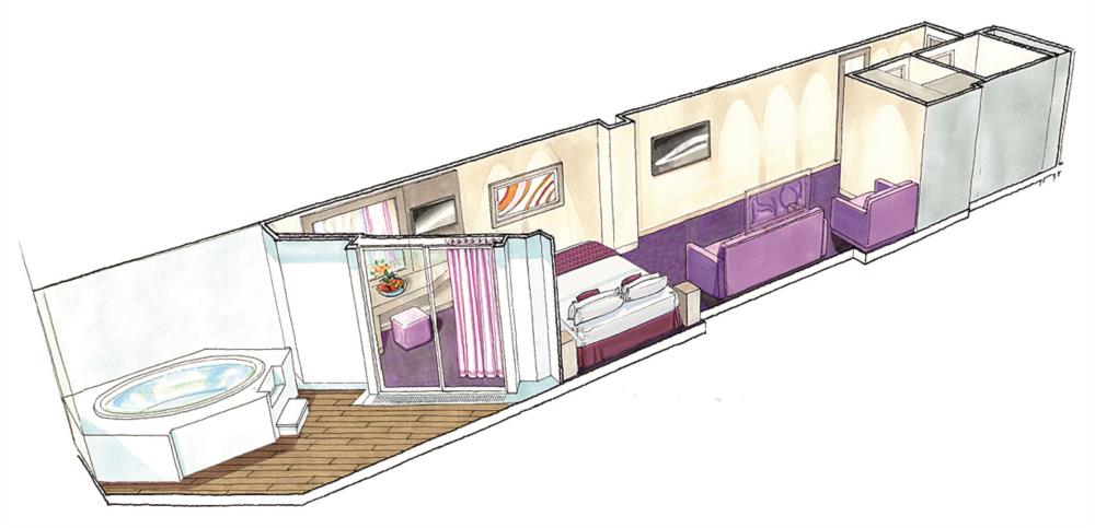 Площадь каюты: ~ 35-49 м2 (балкона ~ 10-21 м2)