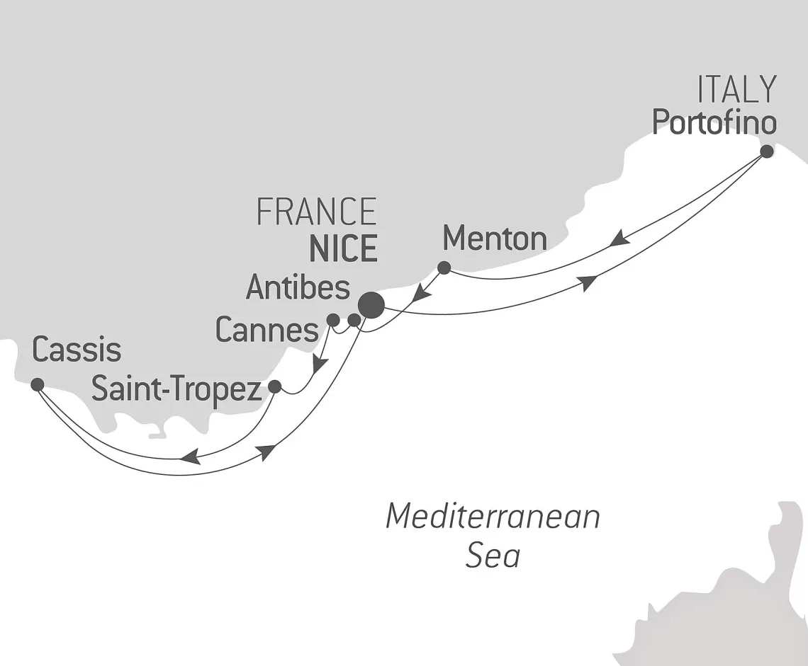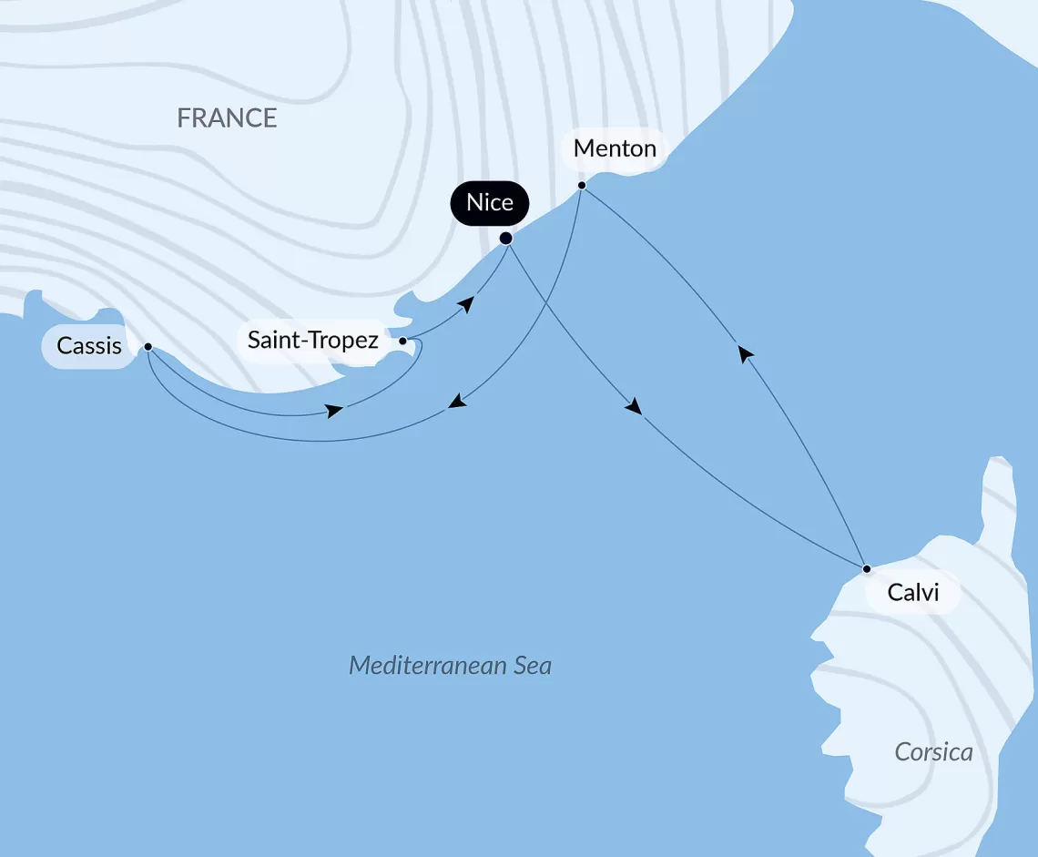 Маршрут круиза: Ницца - Сен-Флоран, о. Корсика - Аяччо, о. Корсика - Санта Манза, о. Корсика - Бонифачо, о. Корсика - Роккапина, о. Корсика - Кальви, о. Корсика - Ницца