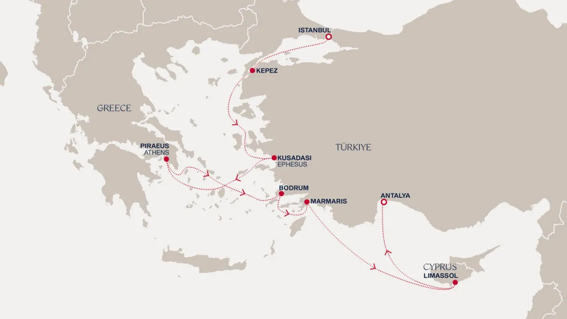 Маршрут круиза: Стамбул - море - о. Корфу - Бари - Триест - море - Катаколон / Олимпия - Пирей / Афины - Кушадасы / Эфес - Стамбул